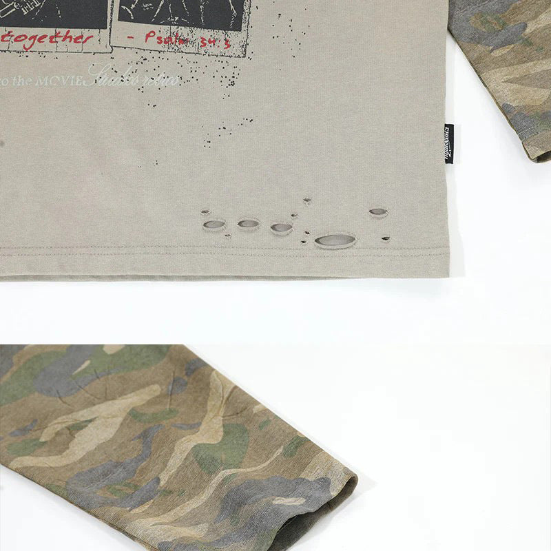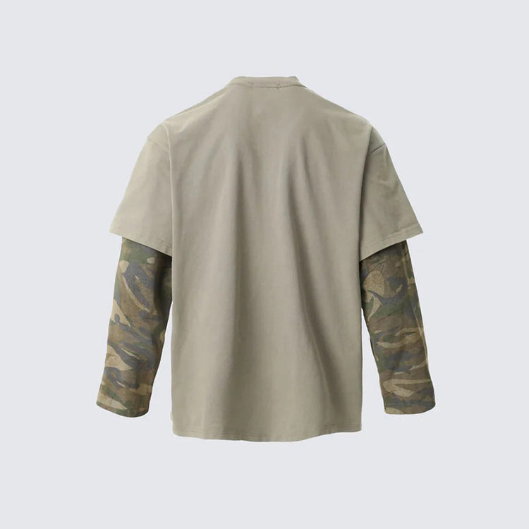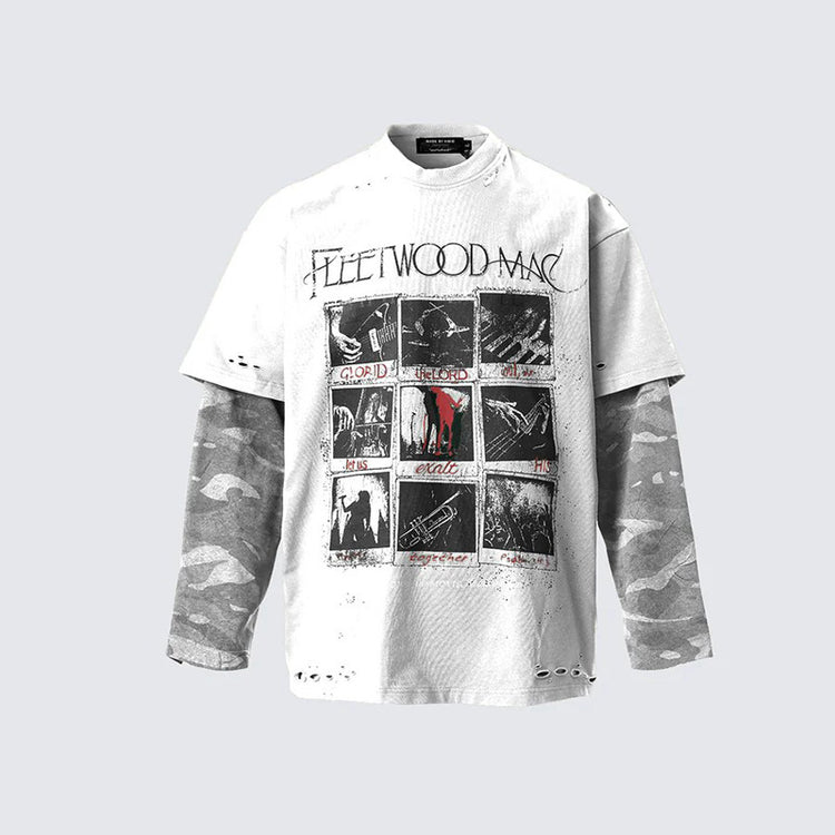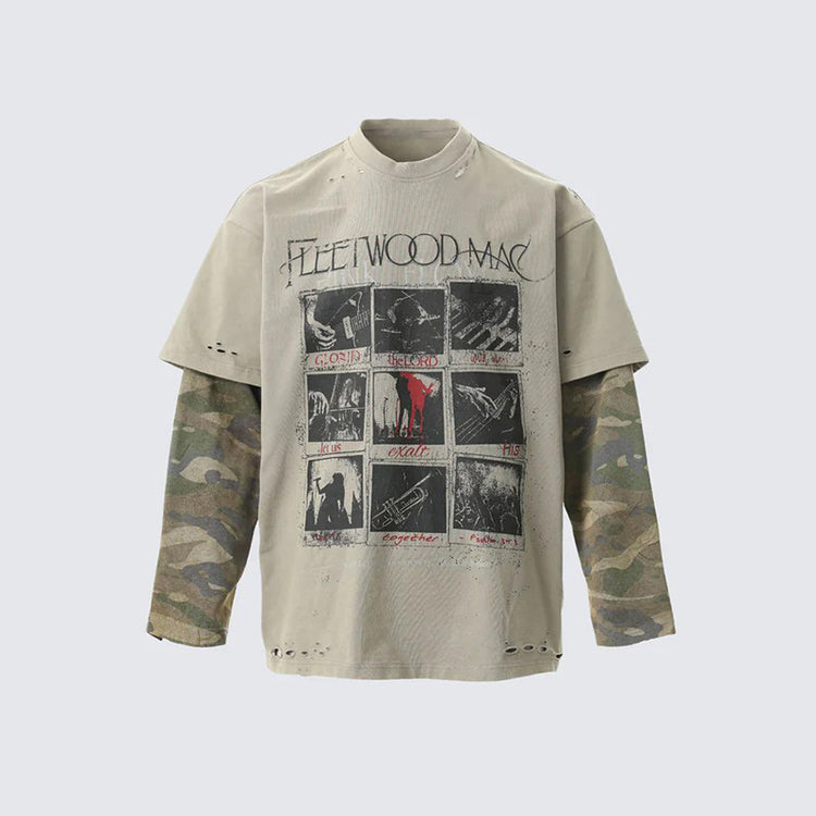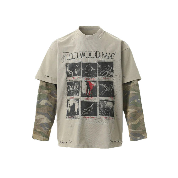 Distressed and ripped long-sleeved faux two-piece T-shirt