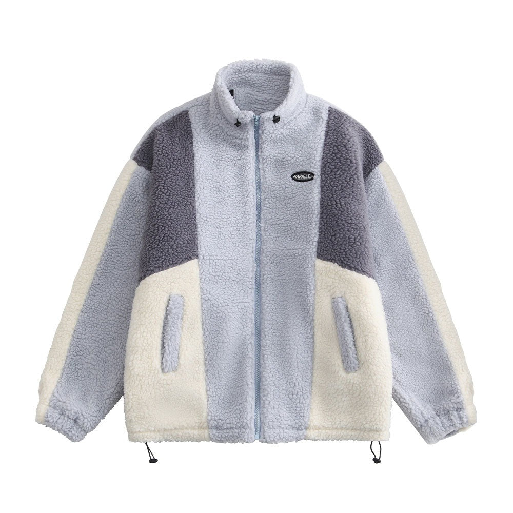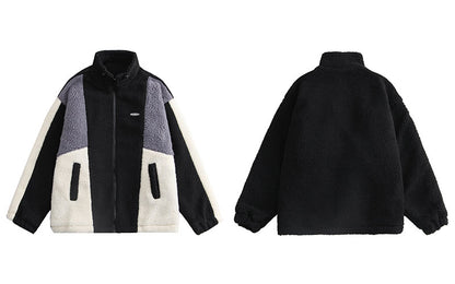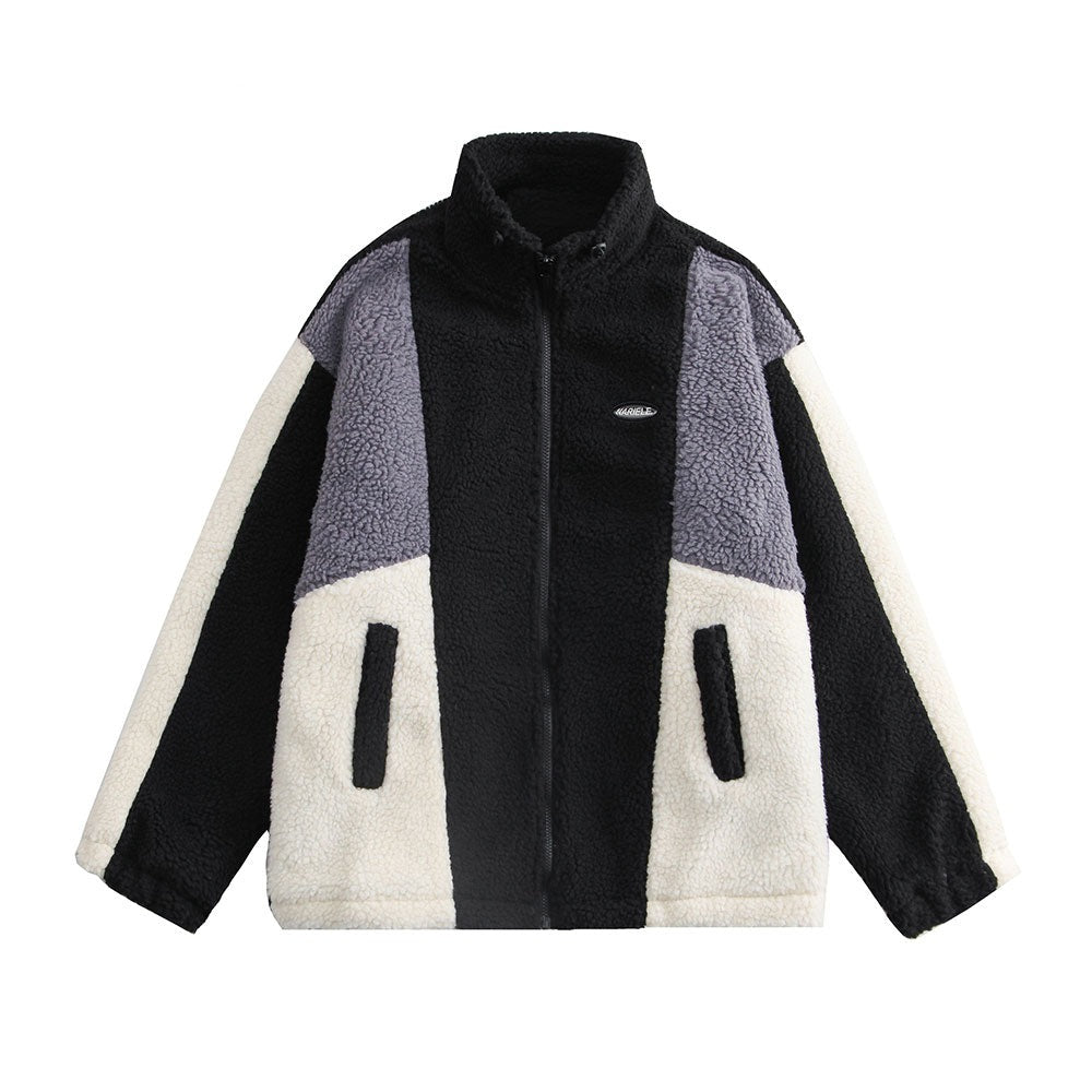 Farbblock-Patchwork-Baumwolle, dicke, warme Varsity-Fuzzy-Manteljacken