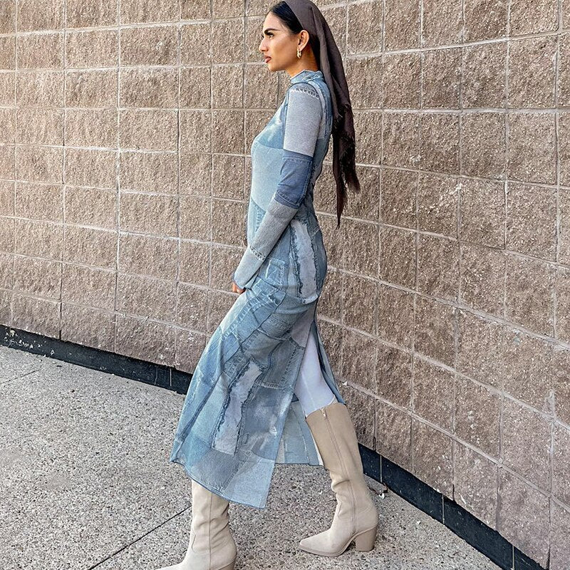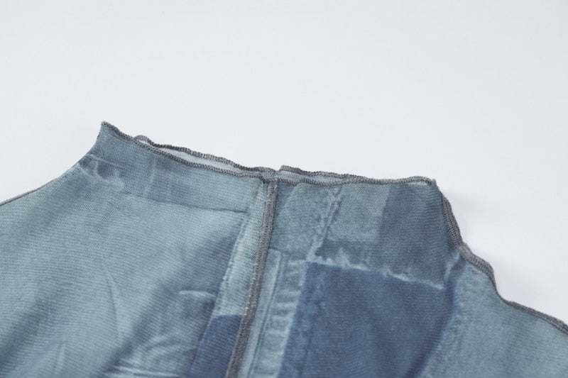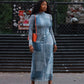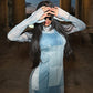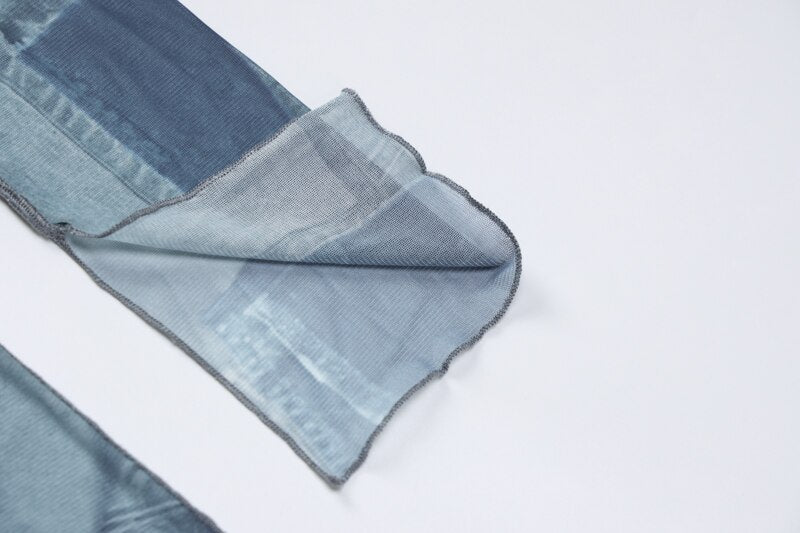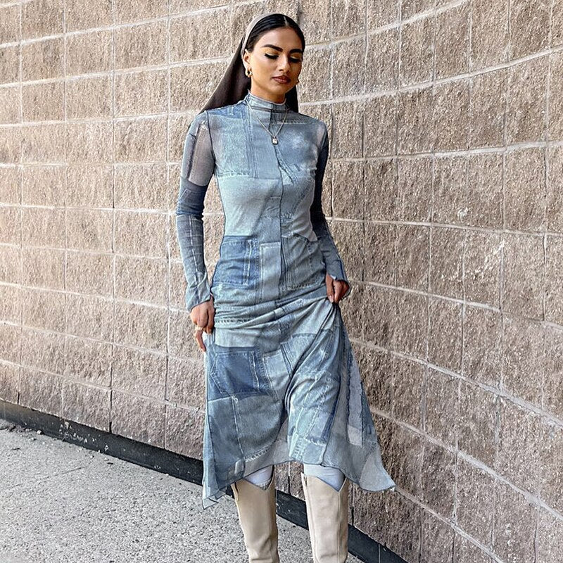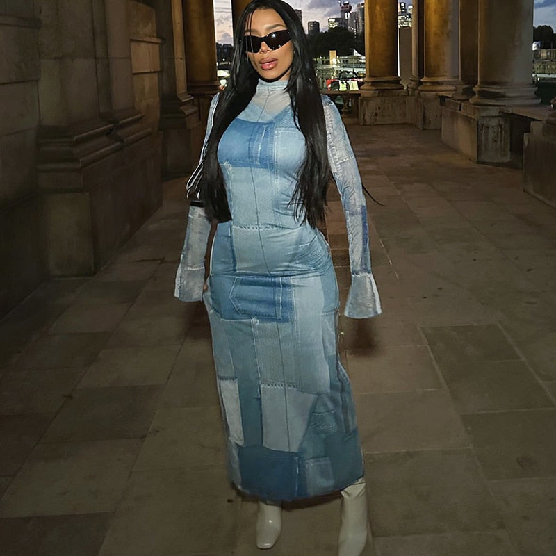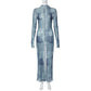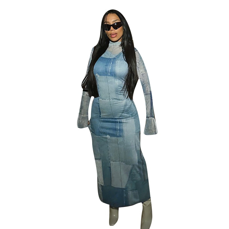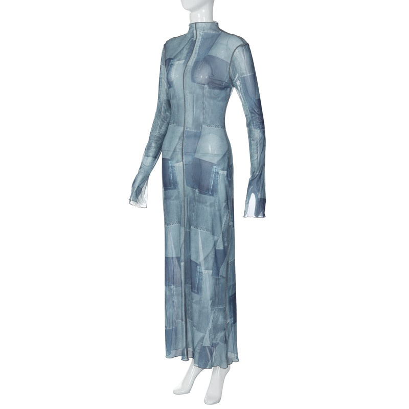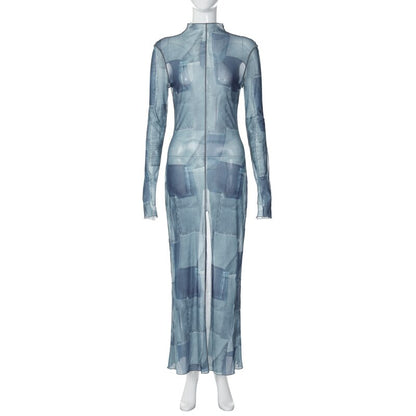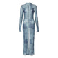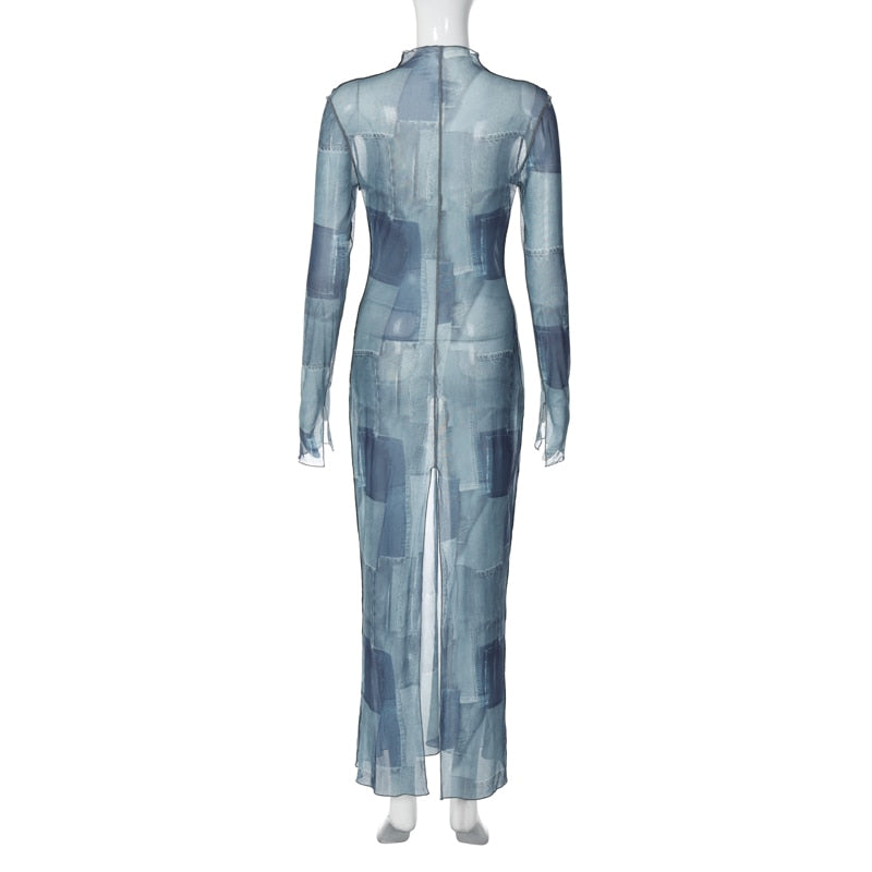 Mesh O Neck Long Flare Sleeve Print Schlitz Vintage Sexy Bodycon Maxikleid