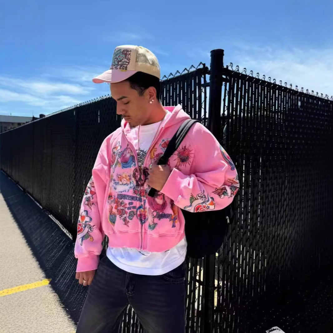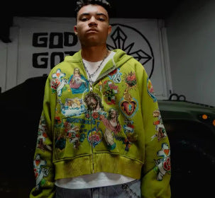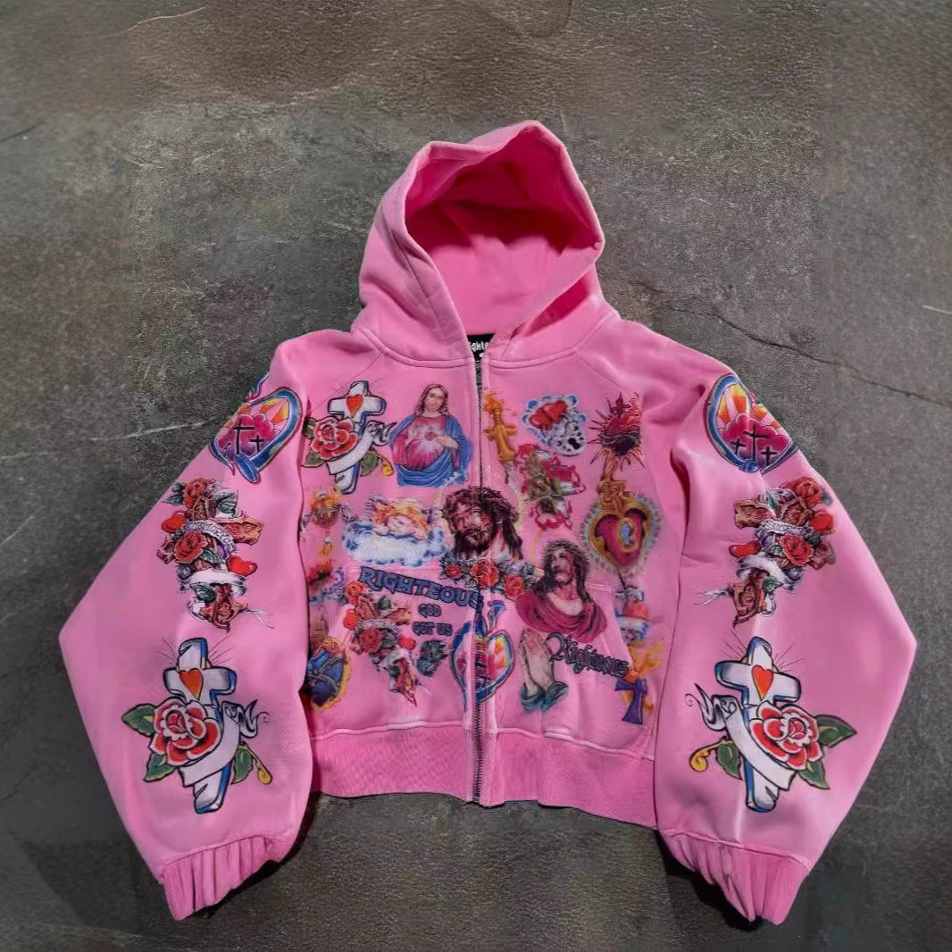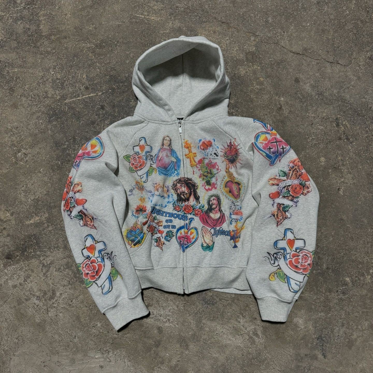 RIGHTEOUS Jesus Cross Cartoon Hooded Zip-up Sweatshirt