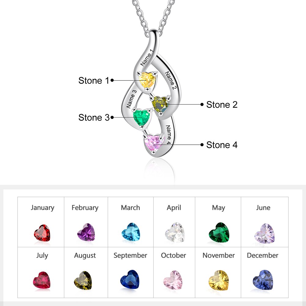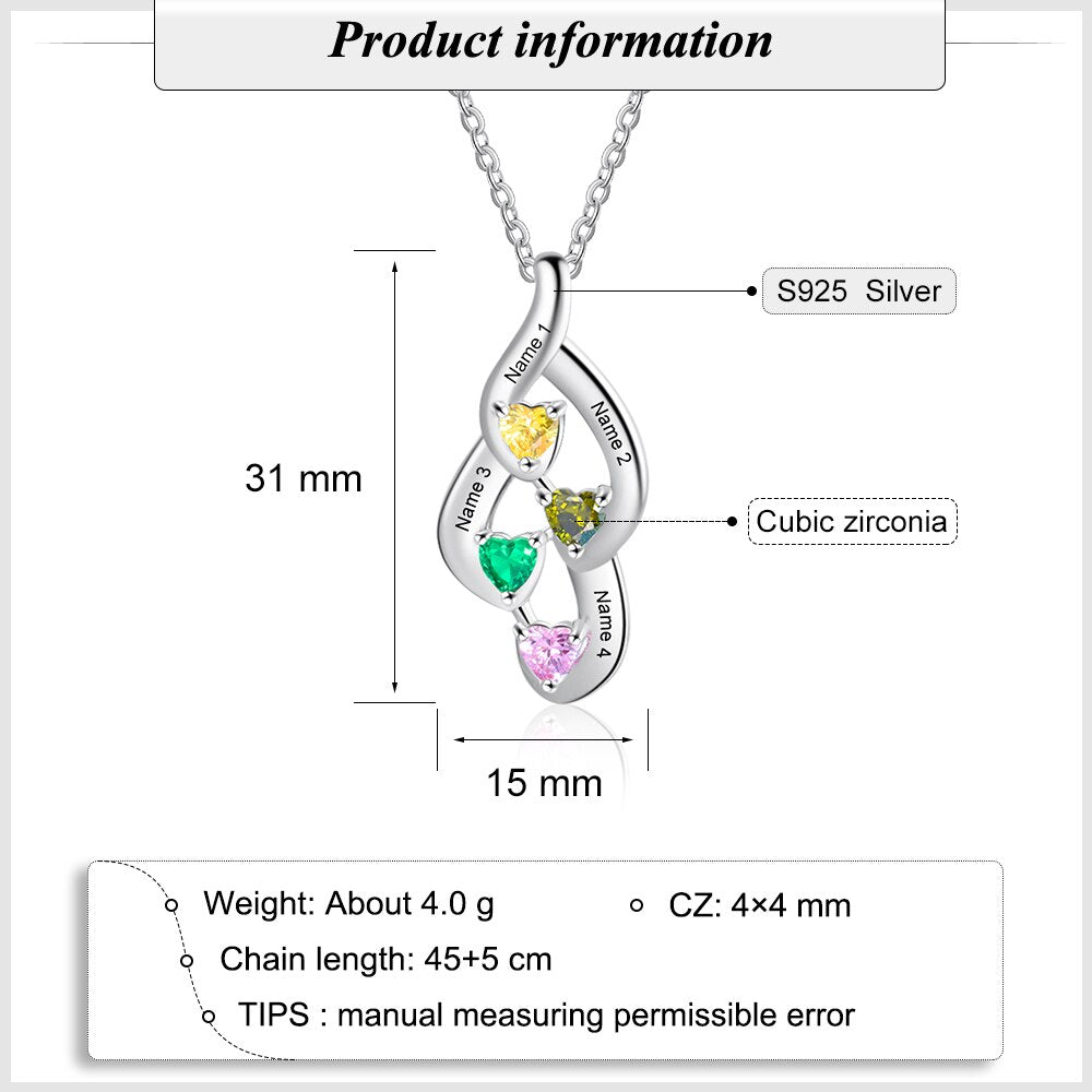 925 Sterling Silver Mother Necklace with 4 Custom Birthstones Name Heart Necklaces