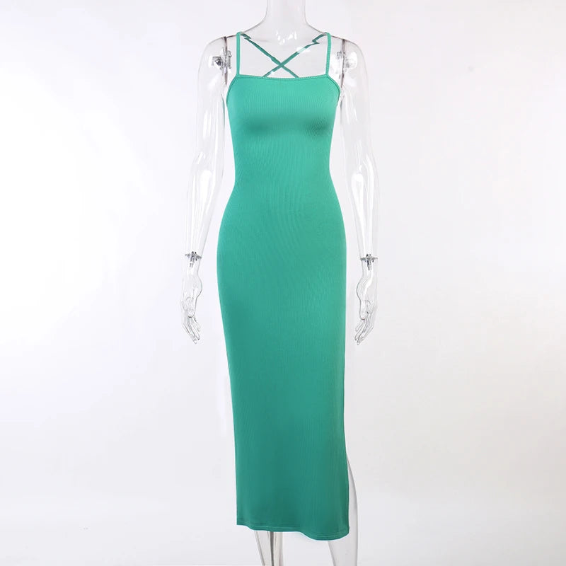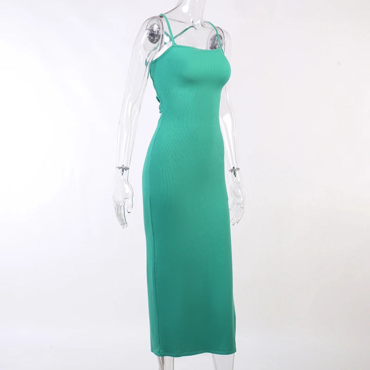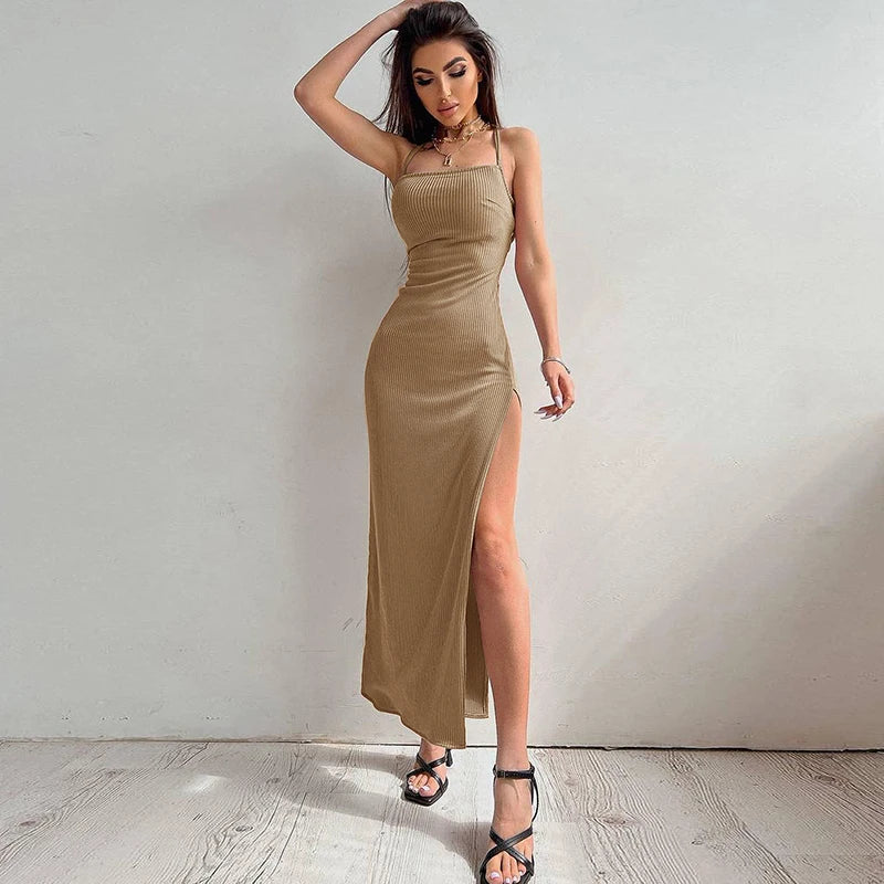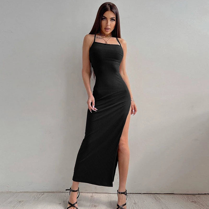 Backless Bandage Slit Dress Knitted Fabric Solid Color Strap Long Dress