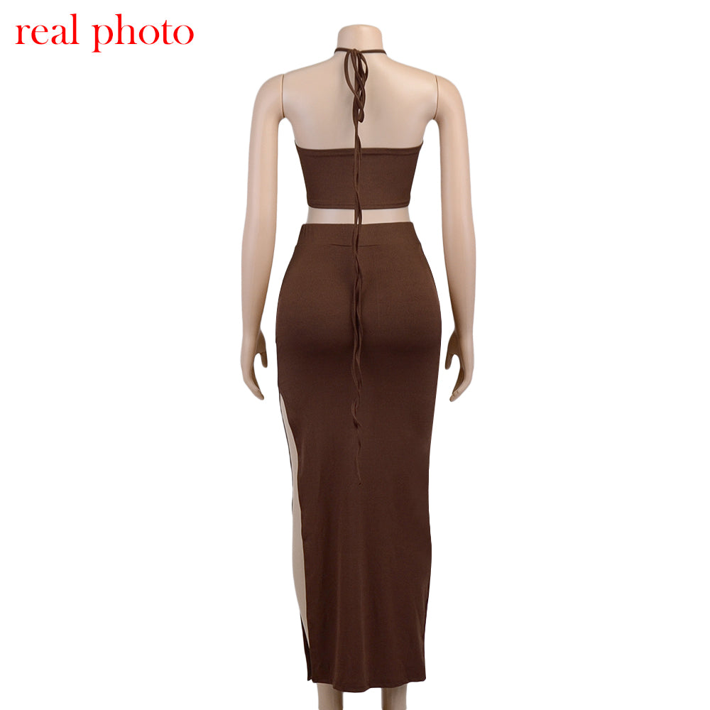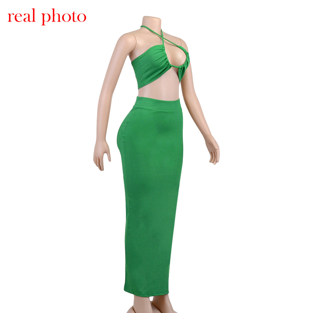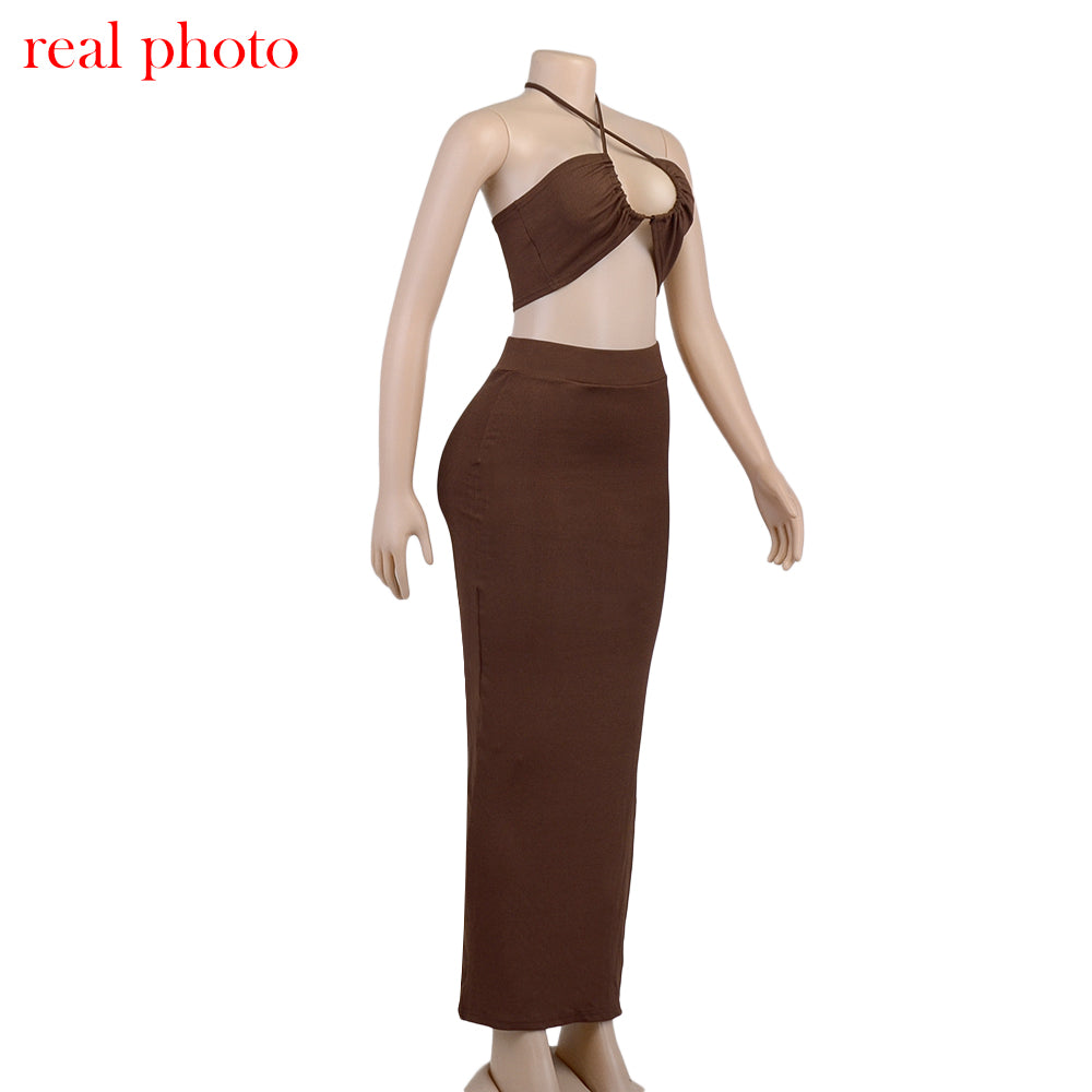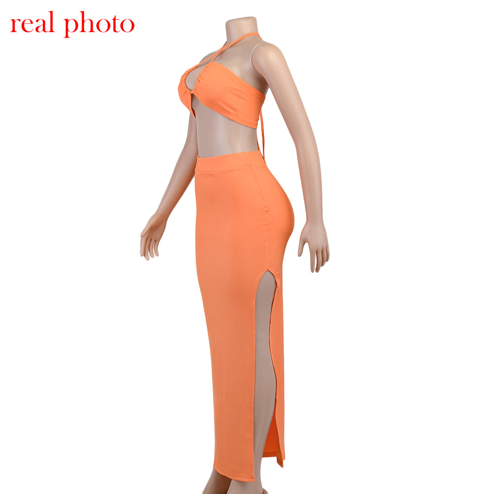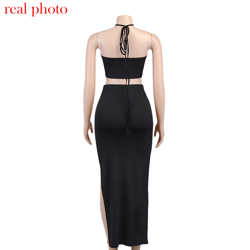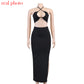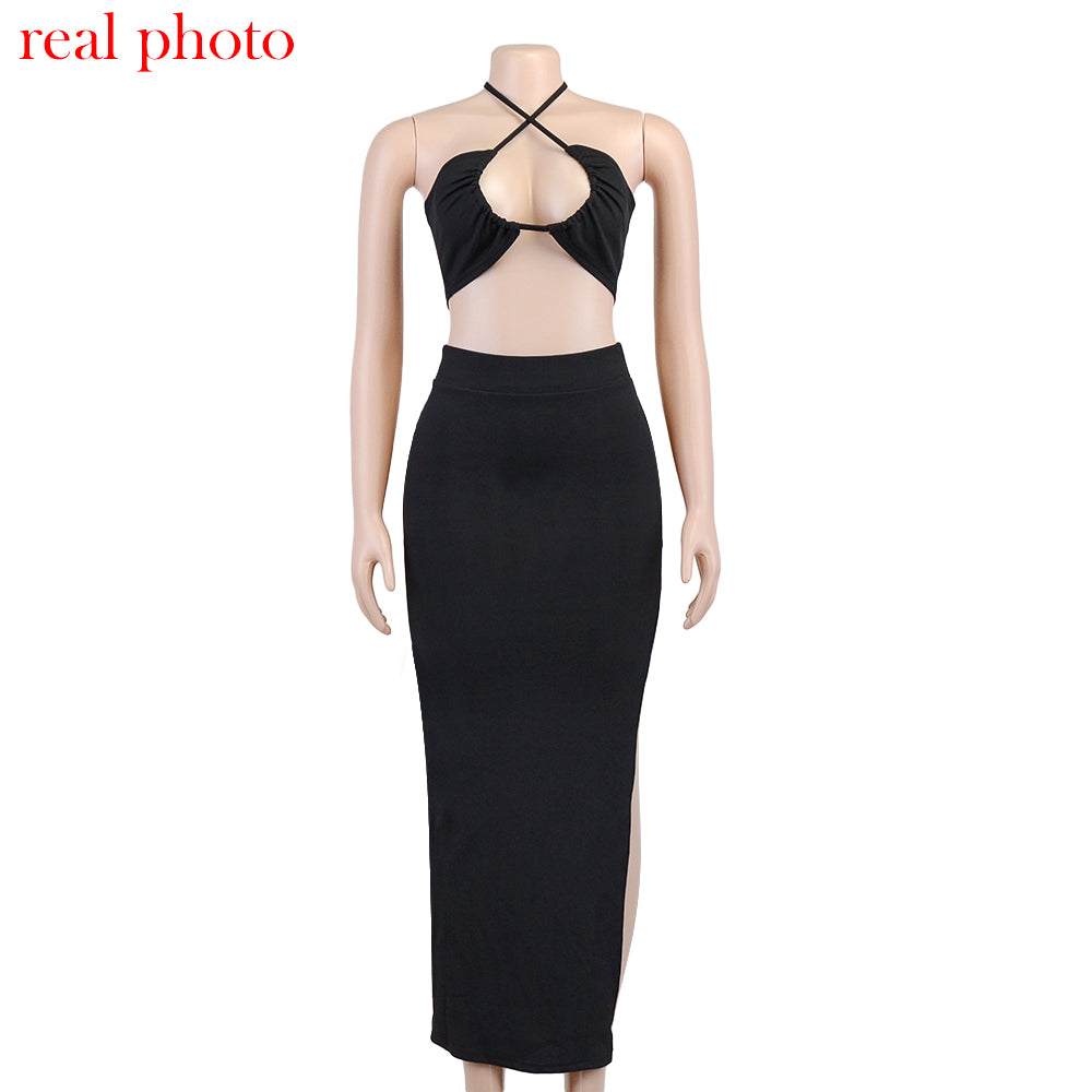 Cryptographic Bandage Cut Out Sexy Halter Neck Top and Skirts Set Gathered Elegant