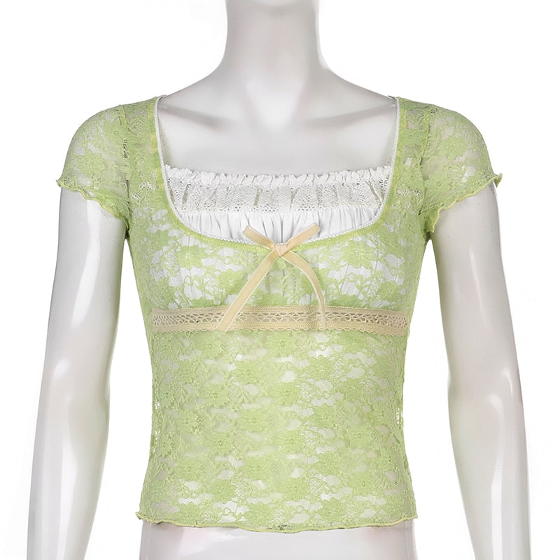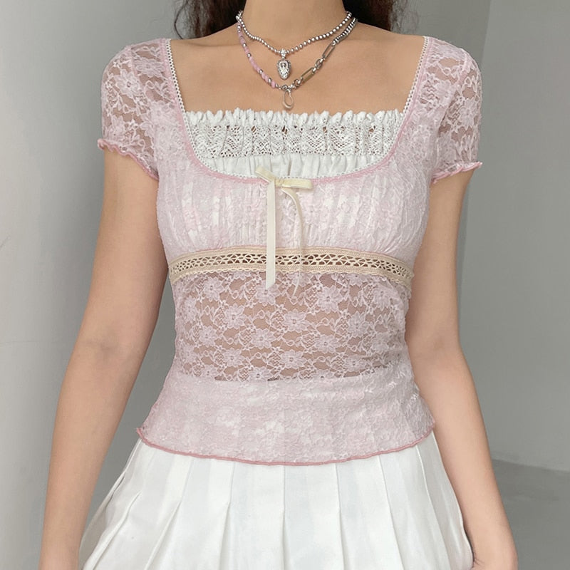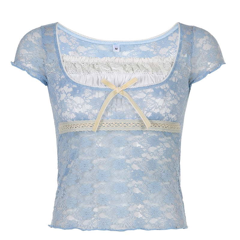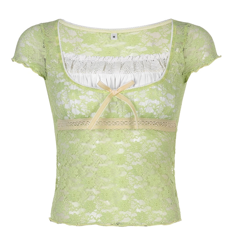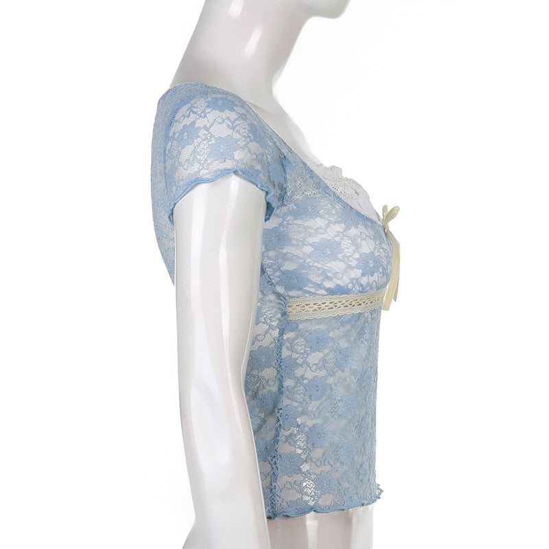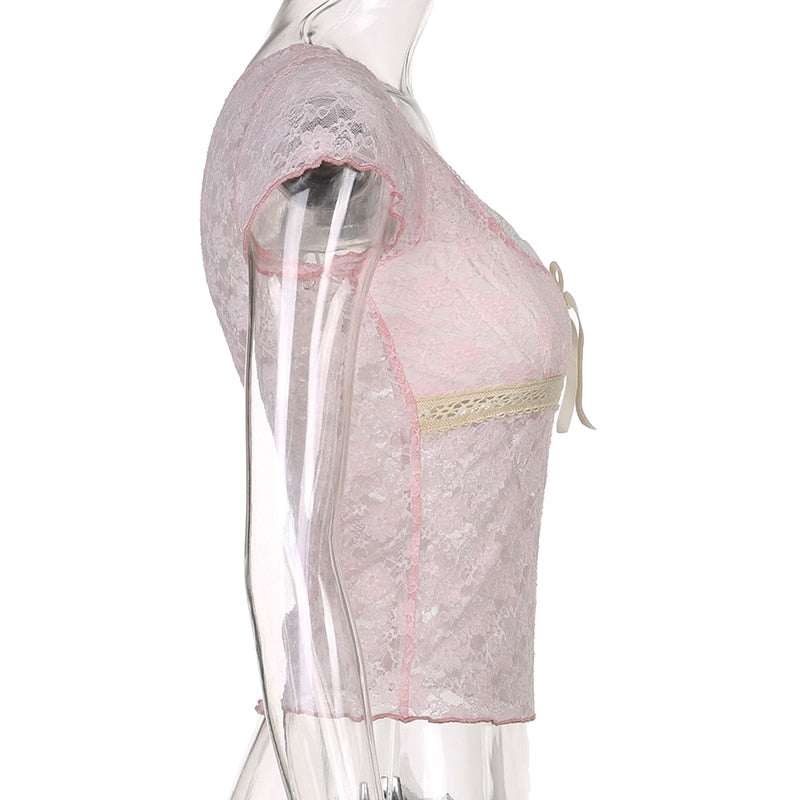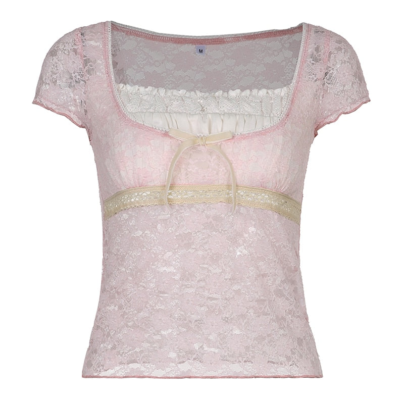 Trim Crop Top Bow Cute Sweet T Shirt Women Retro Short Sleeve Lace Patched Tshirt