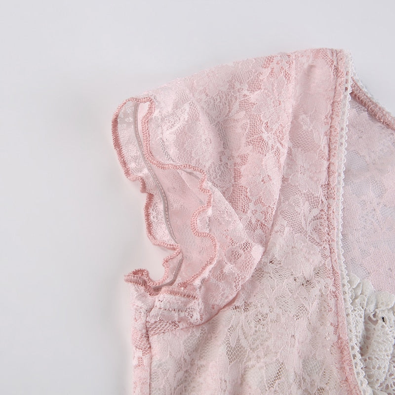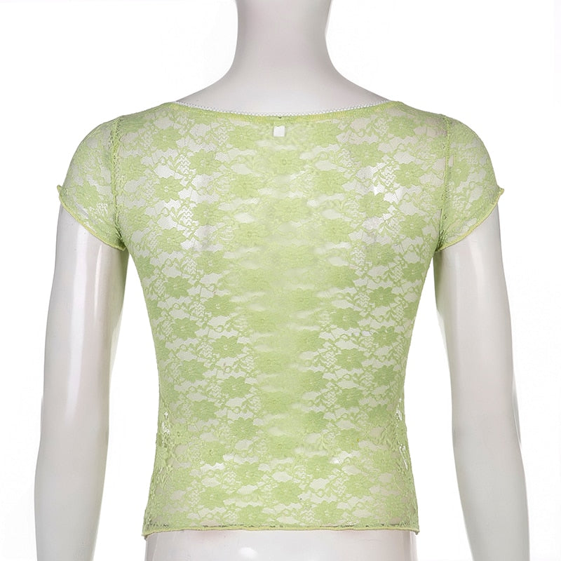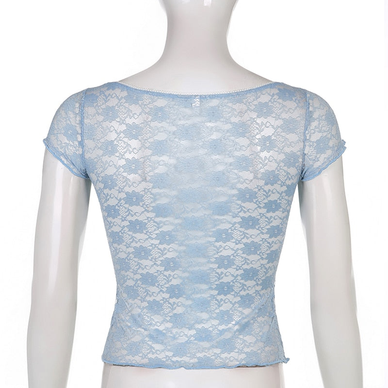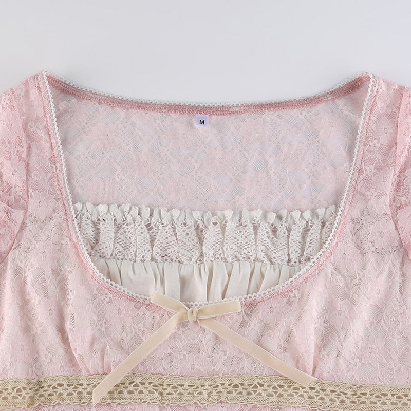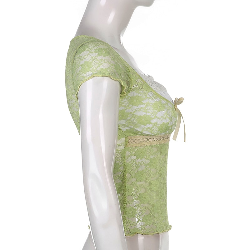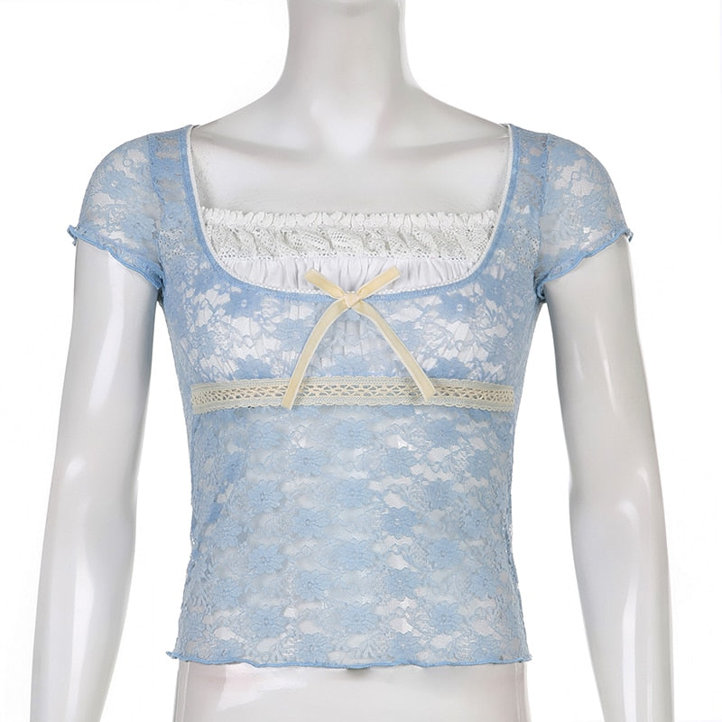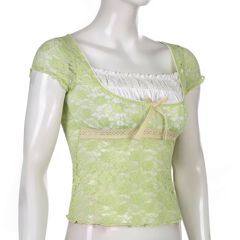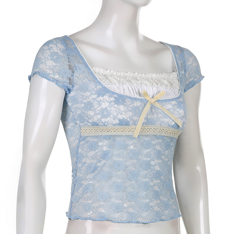 Trim Crop Top Bow Cute Sweet T Shirt Women Retro Short Sleeve Lace Patched Tshirt