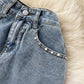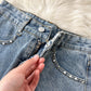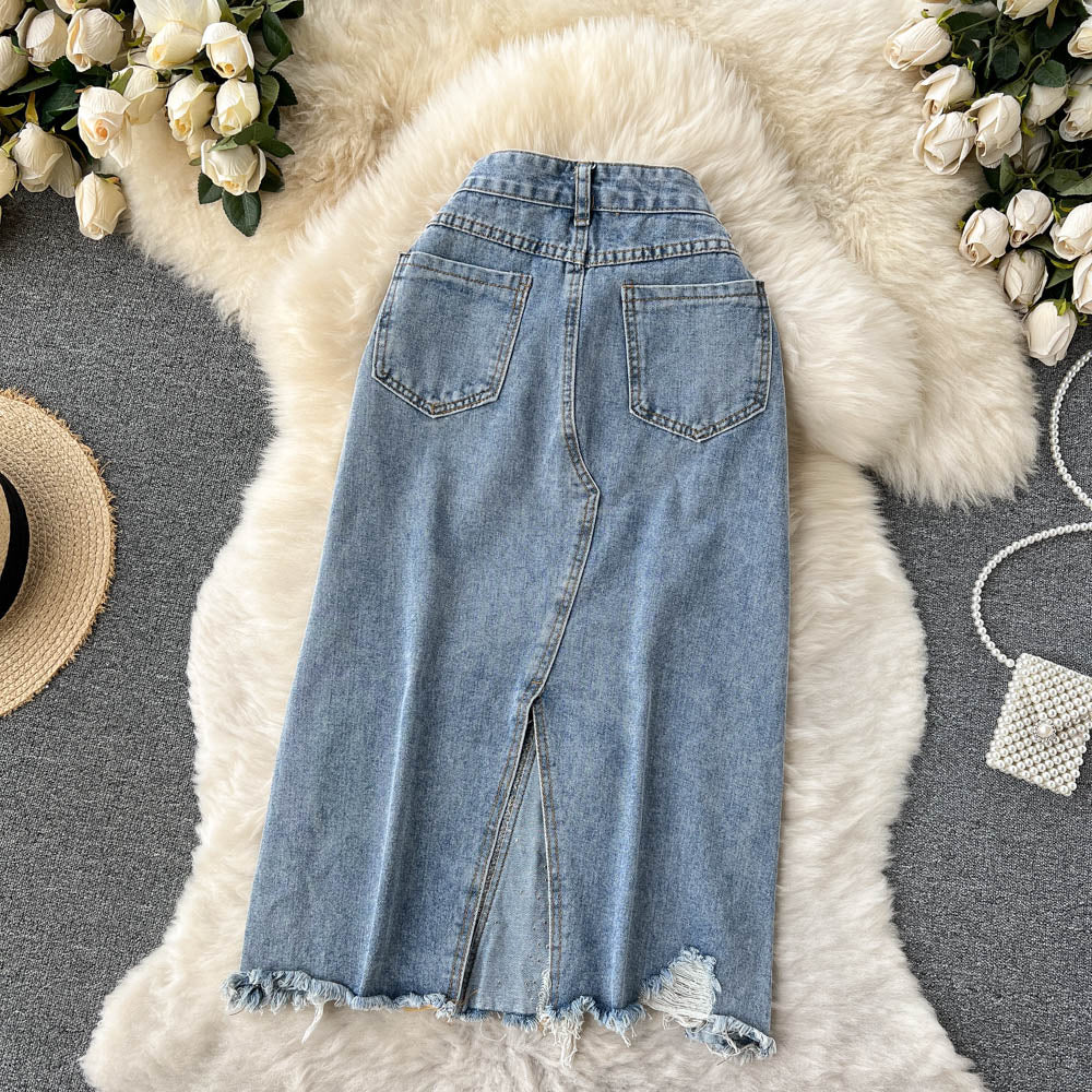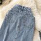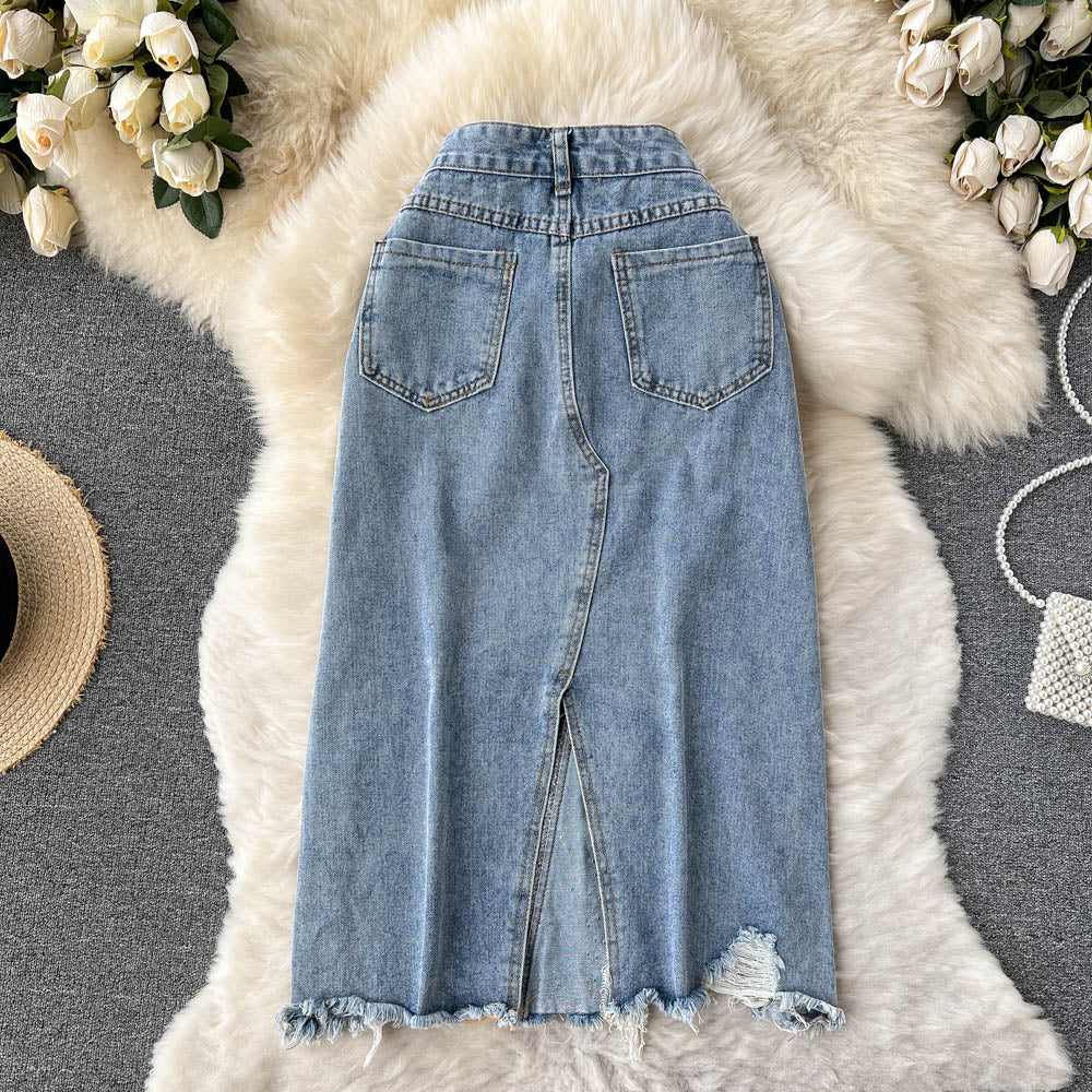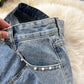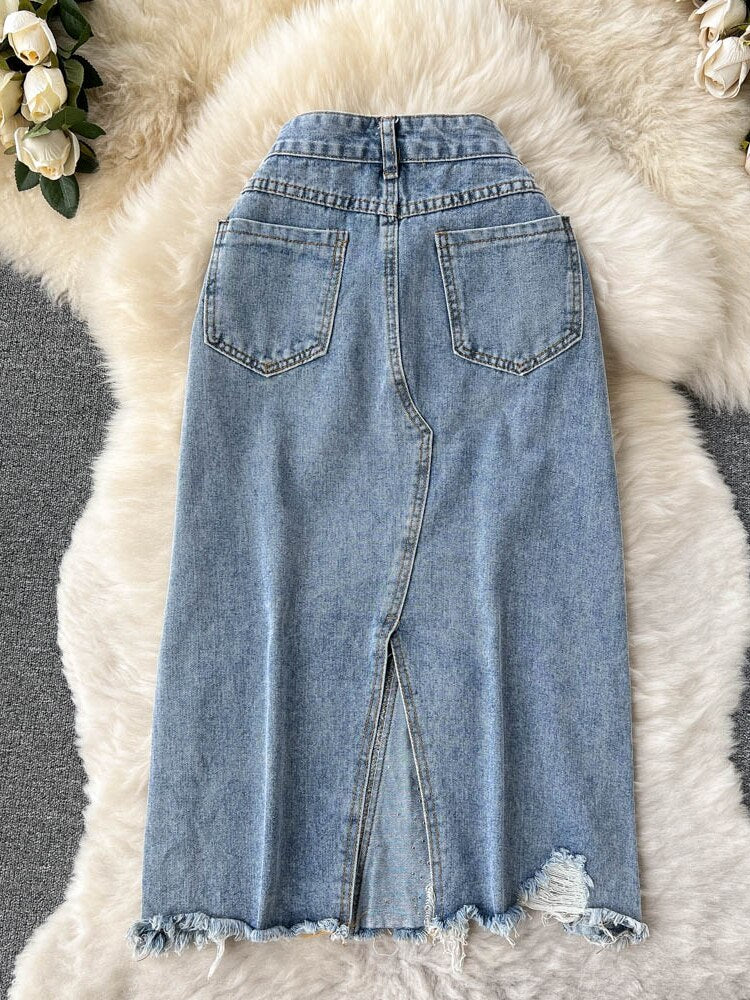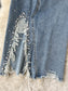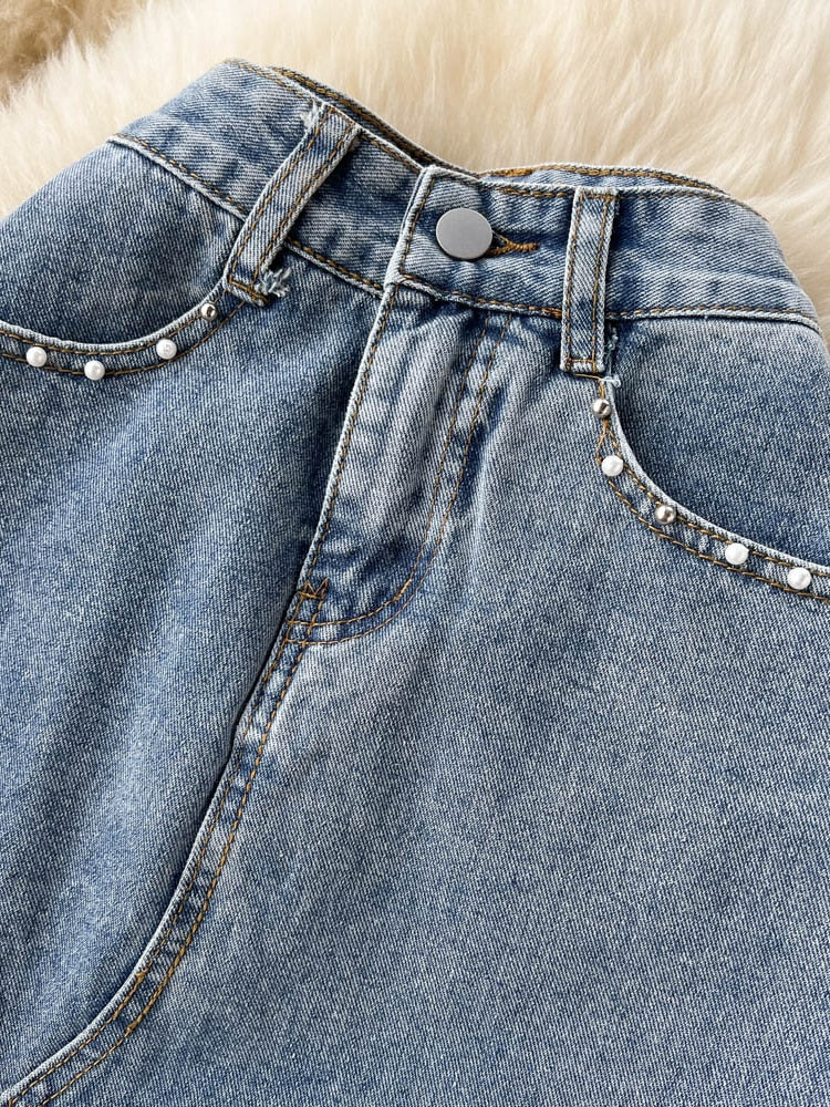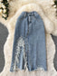 Beading Split Denim Skirts Women High Waist A-line Irregular Jeans Skirts