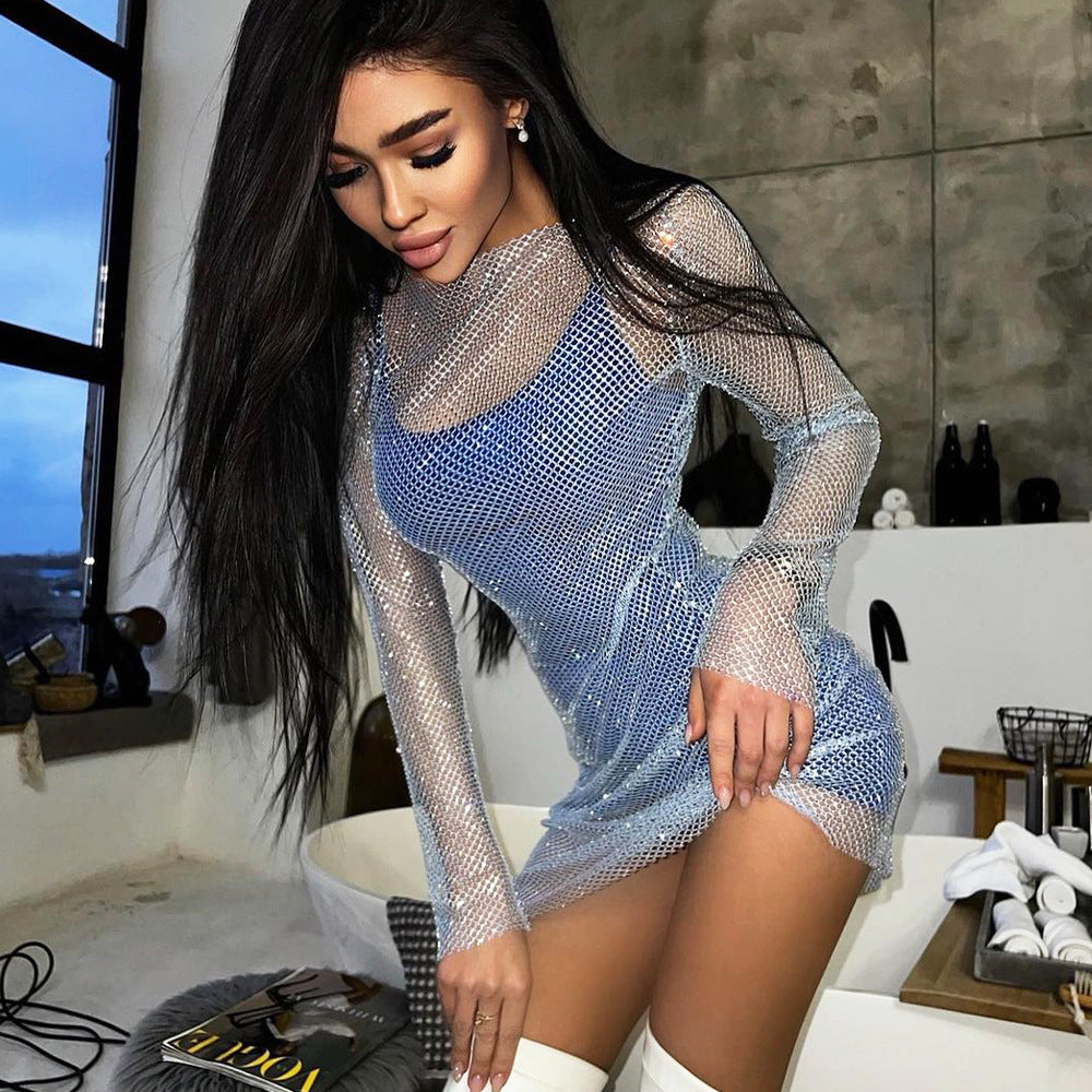 2022 Summer Sexy Girls See Through Mesh Night Club Warp Dress Long Sleeve Mini Bodycon