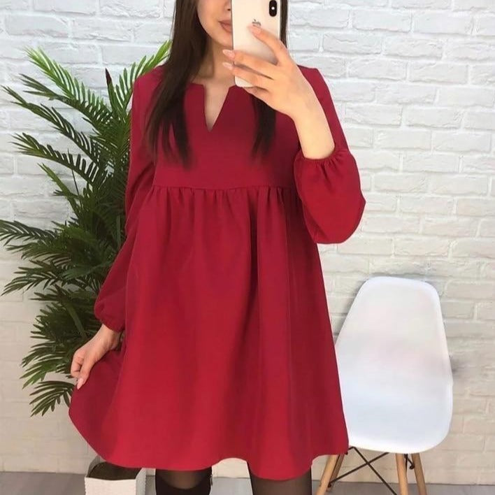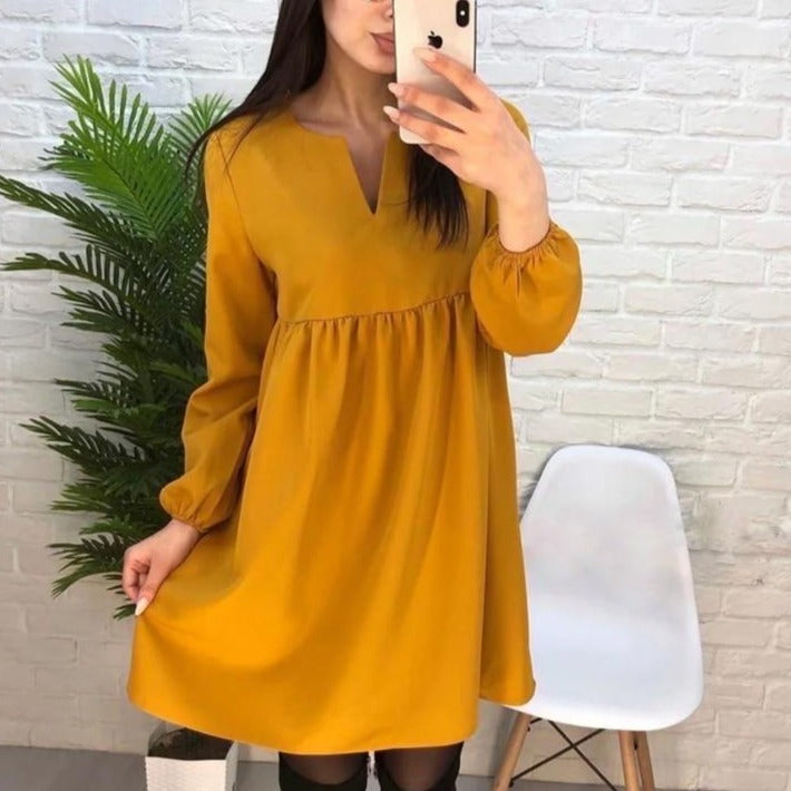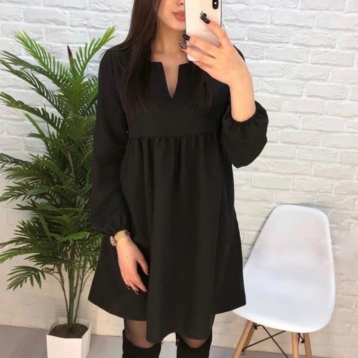 High Waist Mini Dress Long sleeve Sexy V-Neck Solid Color Party Lantern Sleeve Dress