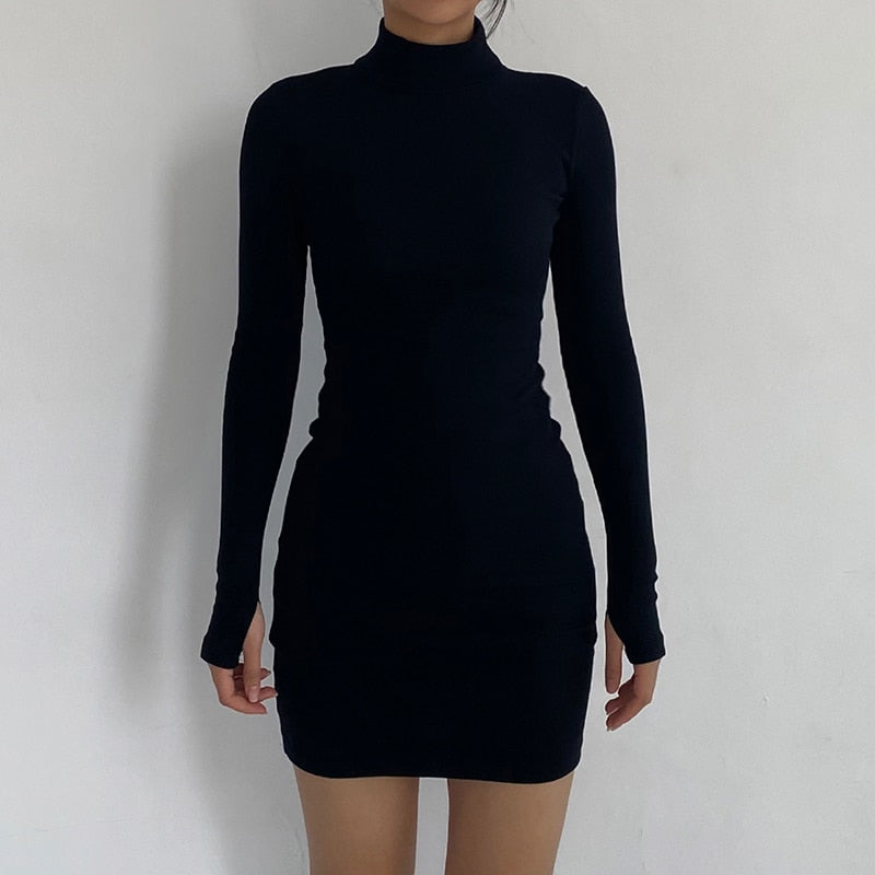 Spring Autumn Fashion Turtleneck Skinny Mini Dress Women Rib Knit Keep Warm Long Sleeve Dress