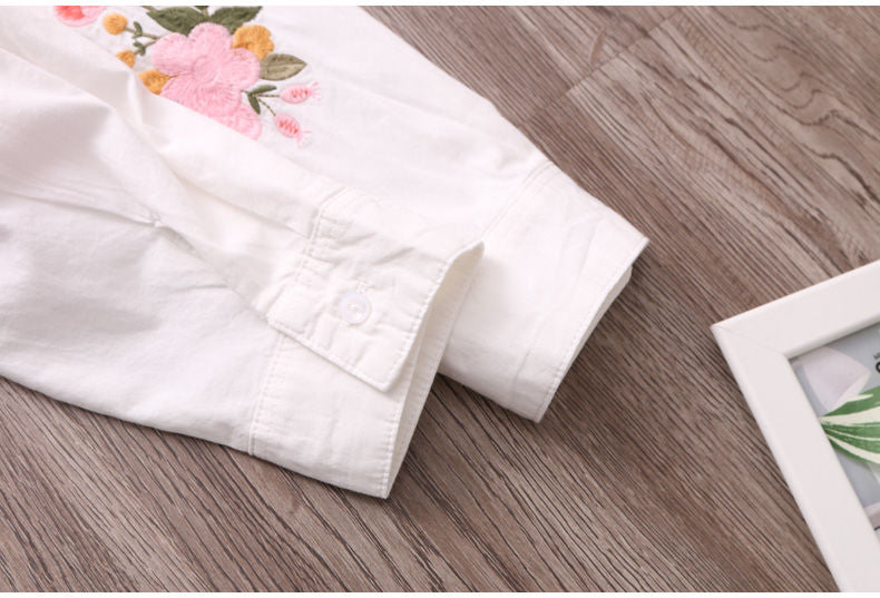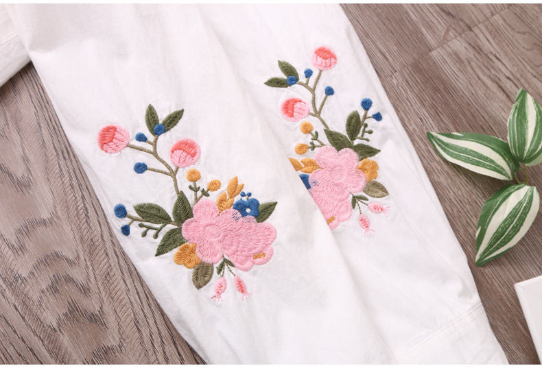 White Shirt Casual Wear Button Up Turn Down Collar Long Sleeve Cotton Blouse Embroidery
