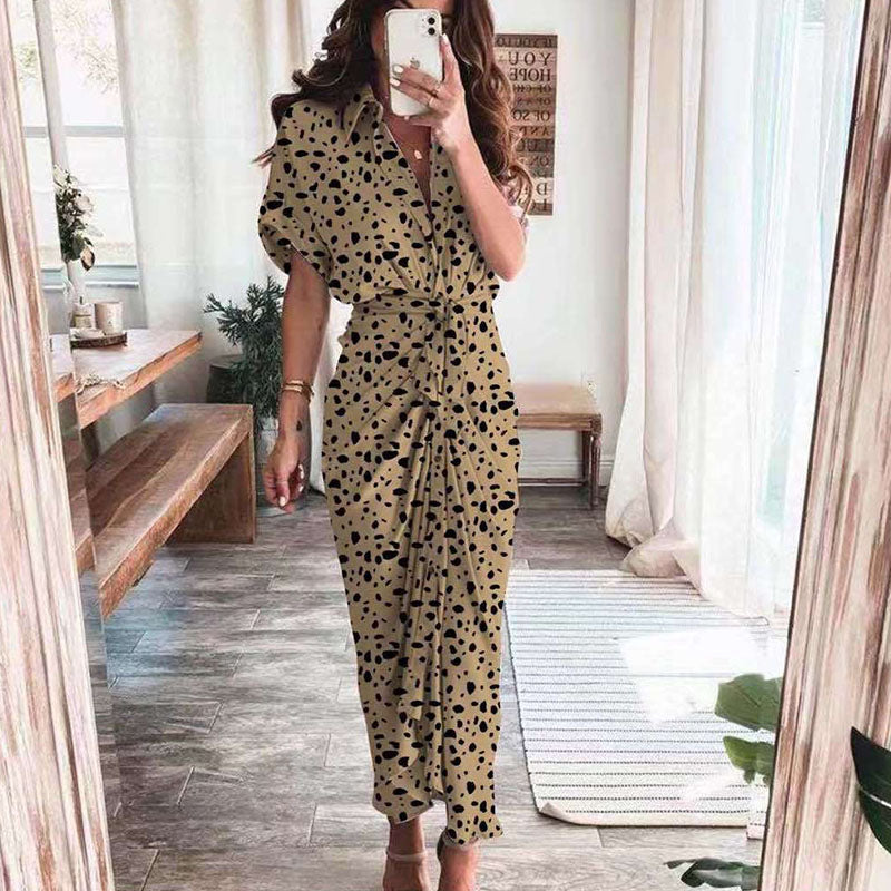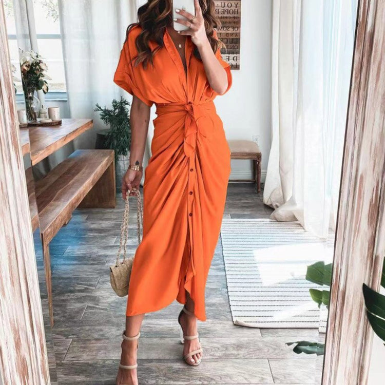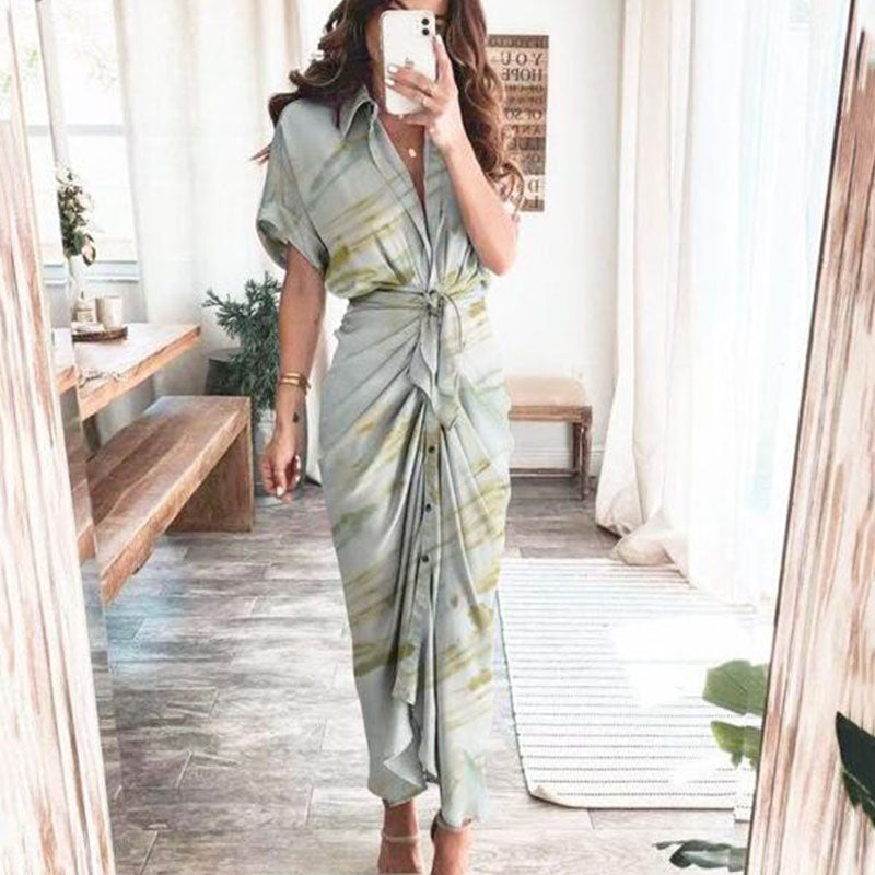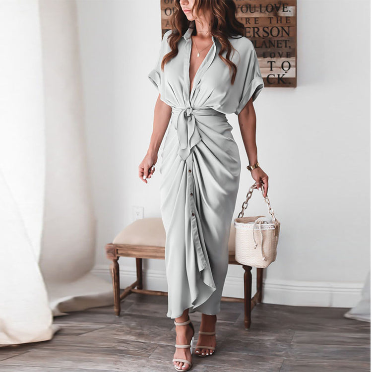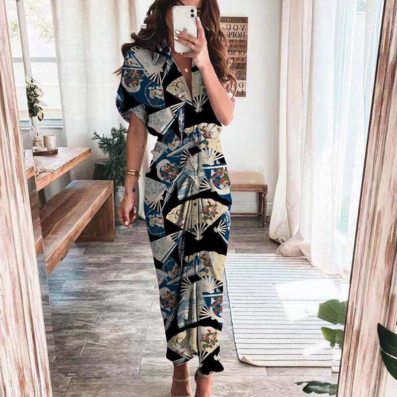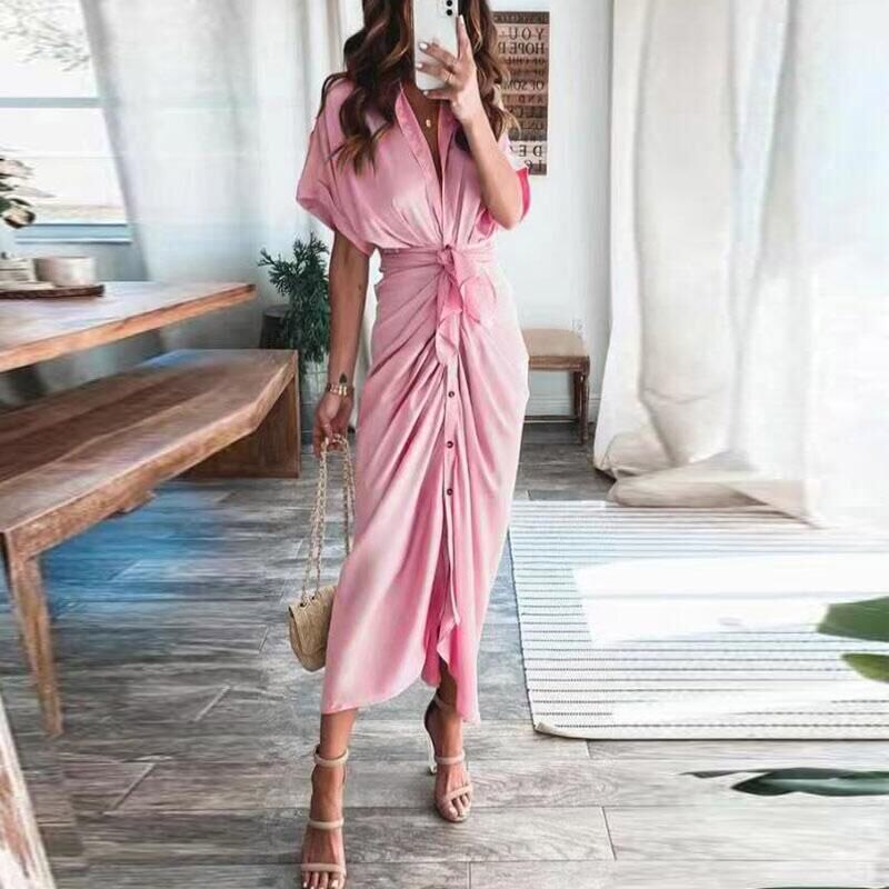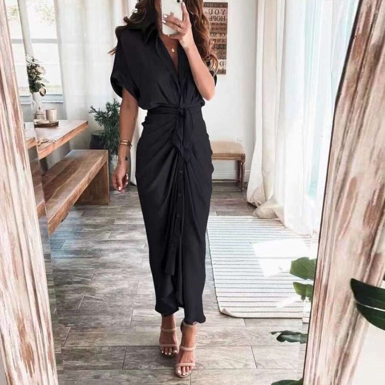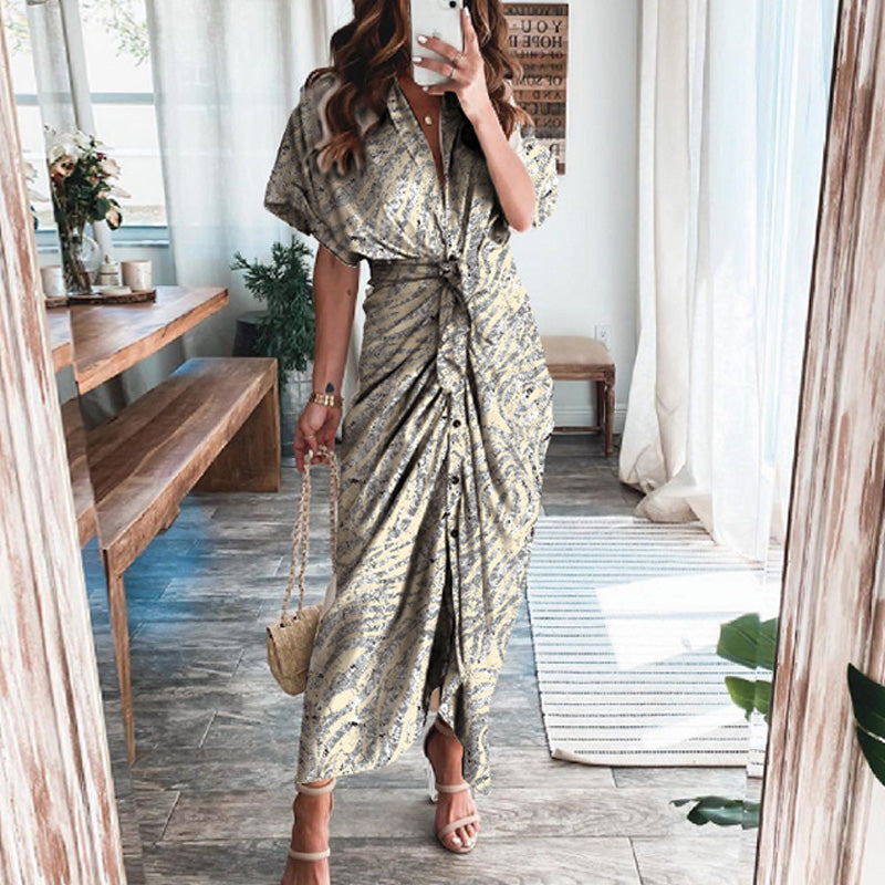 Women Summer Short Sleeve Slit Long Dress Turn-down Collar Elegant Button Draped Party Dresses