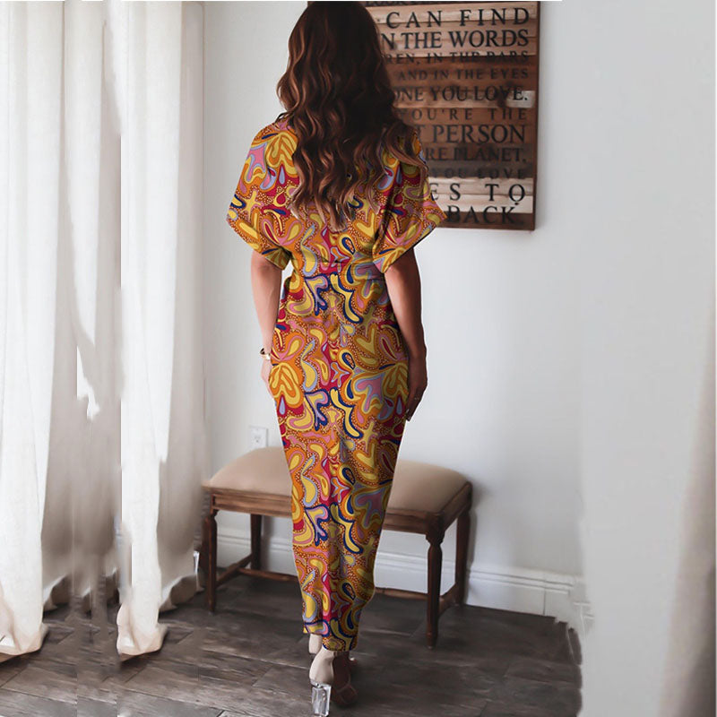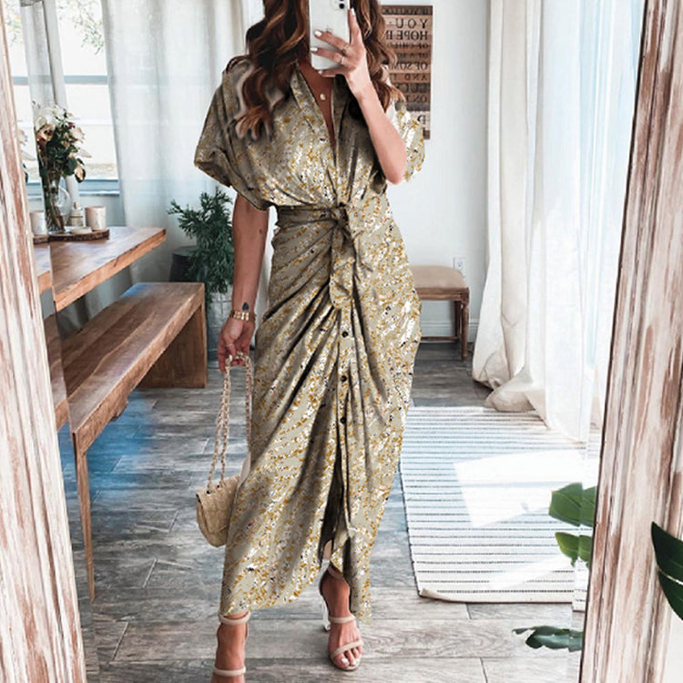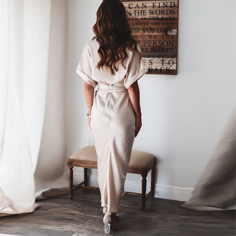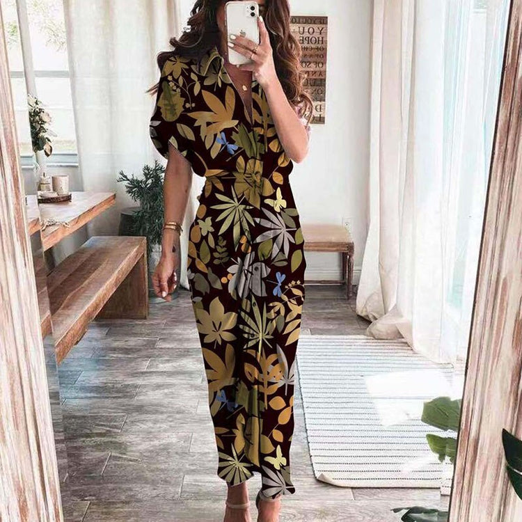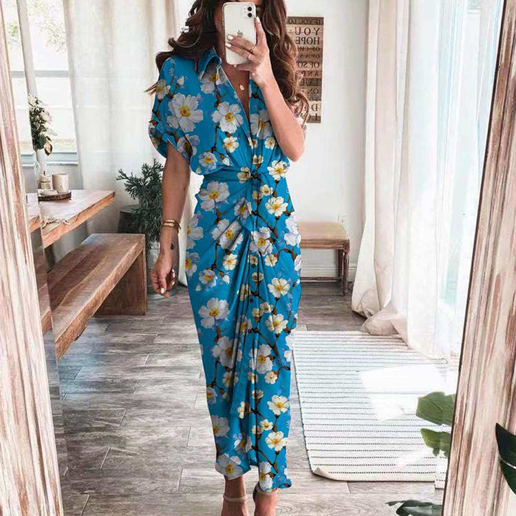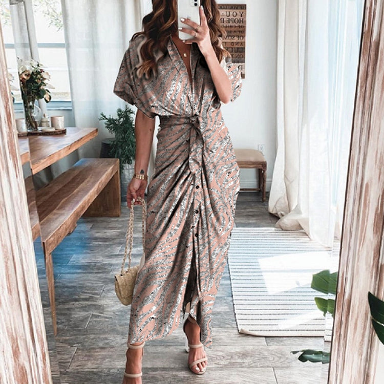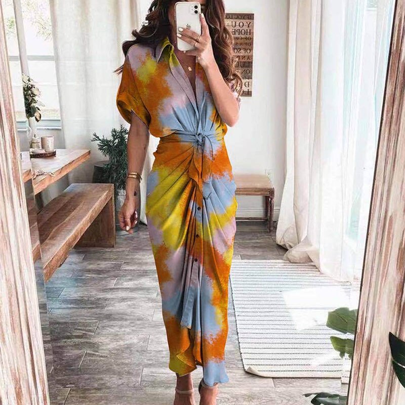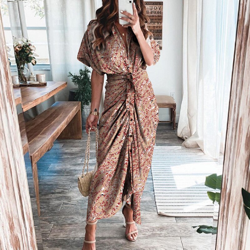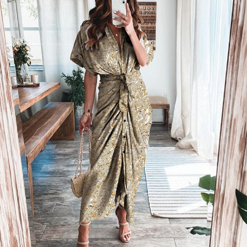 Women Summer Short Sleeve Slit Long Dress Turn-down Collar Elegant Button Draped Party Dresses