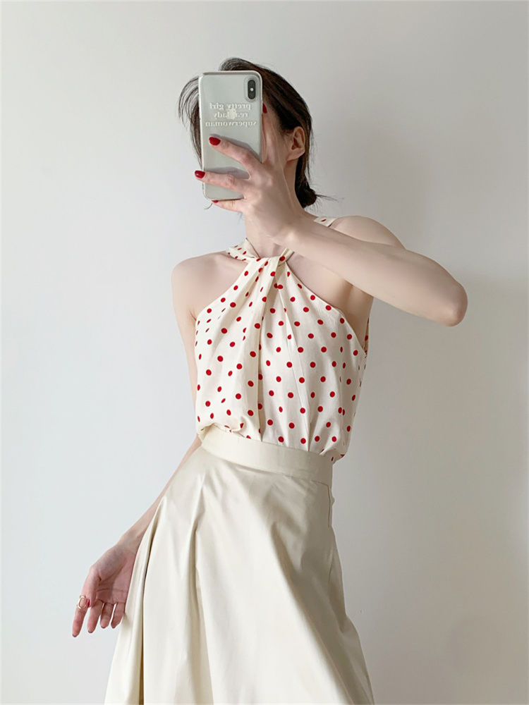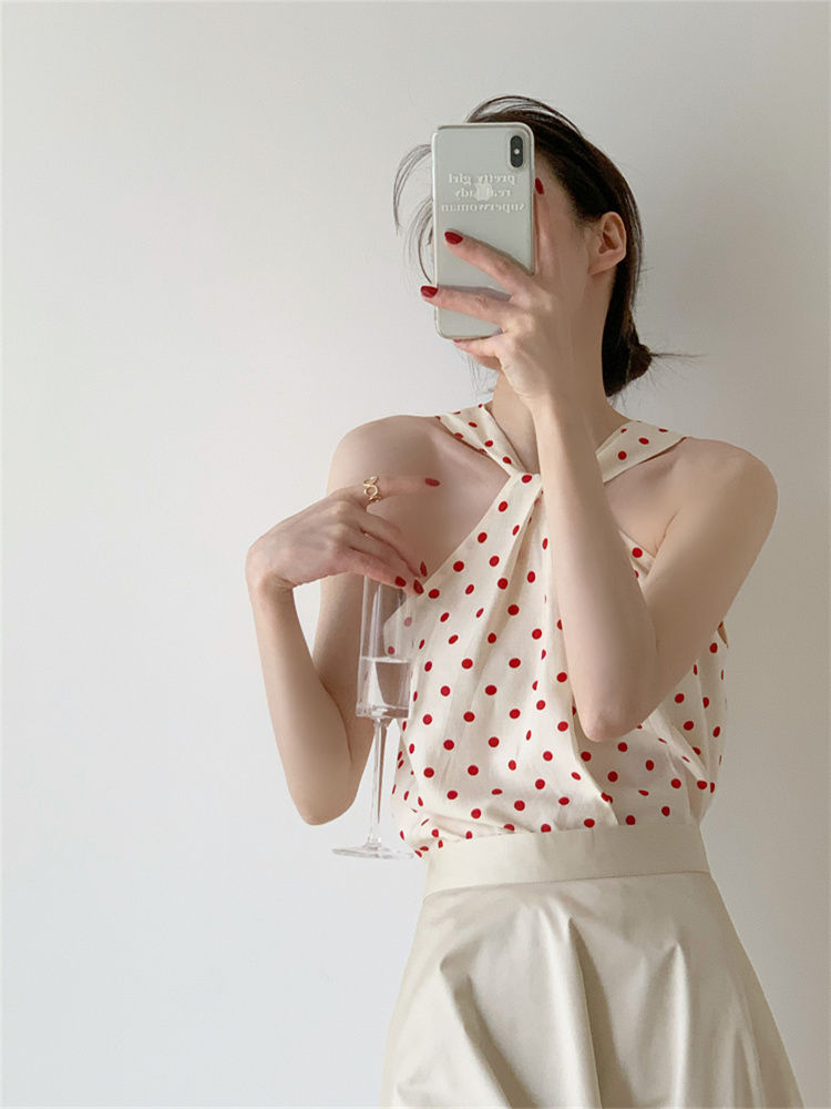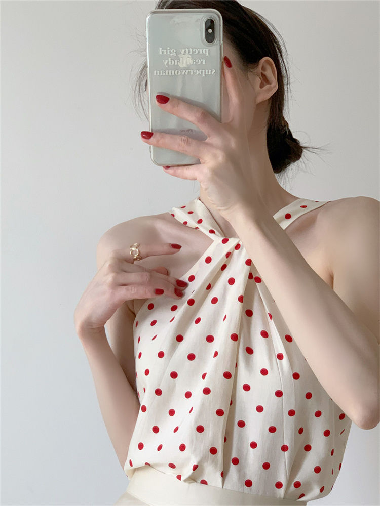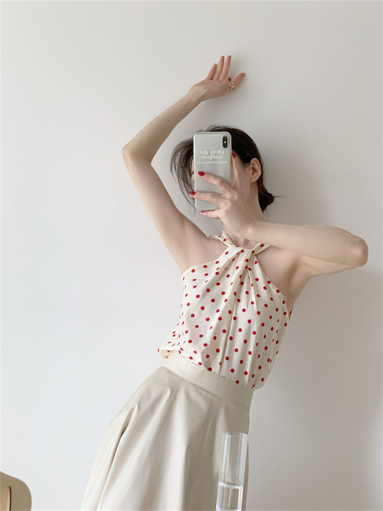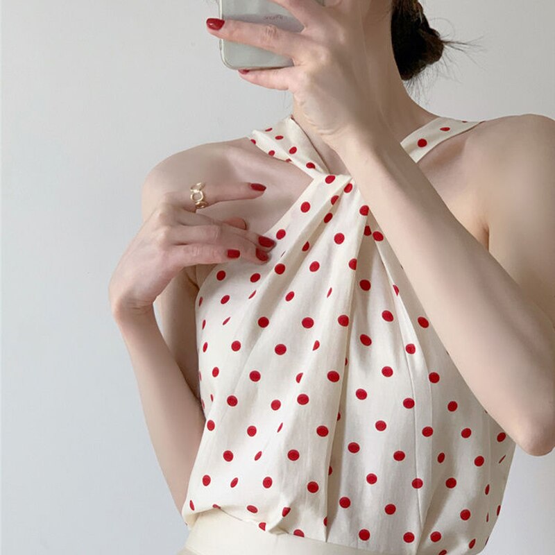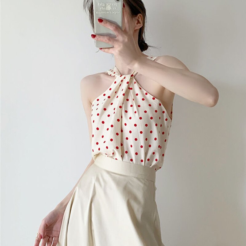 Backless Camis Women Summer Polka Dot Twist Halterneck Vest Female Casual Chiffon Tops
