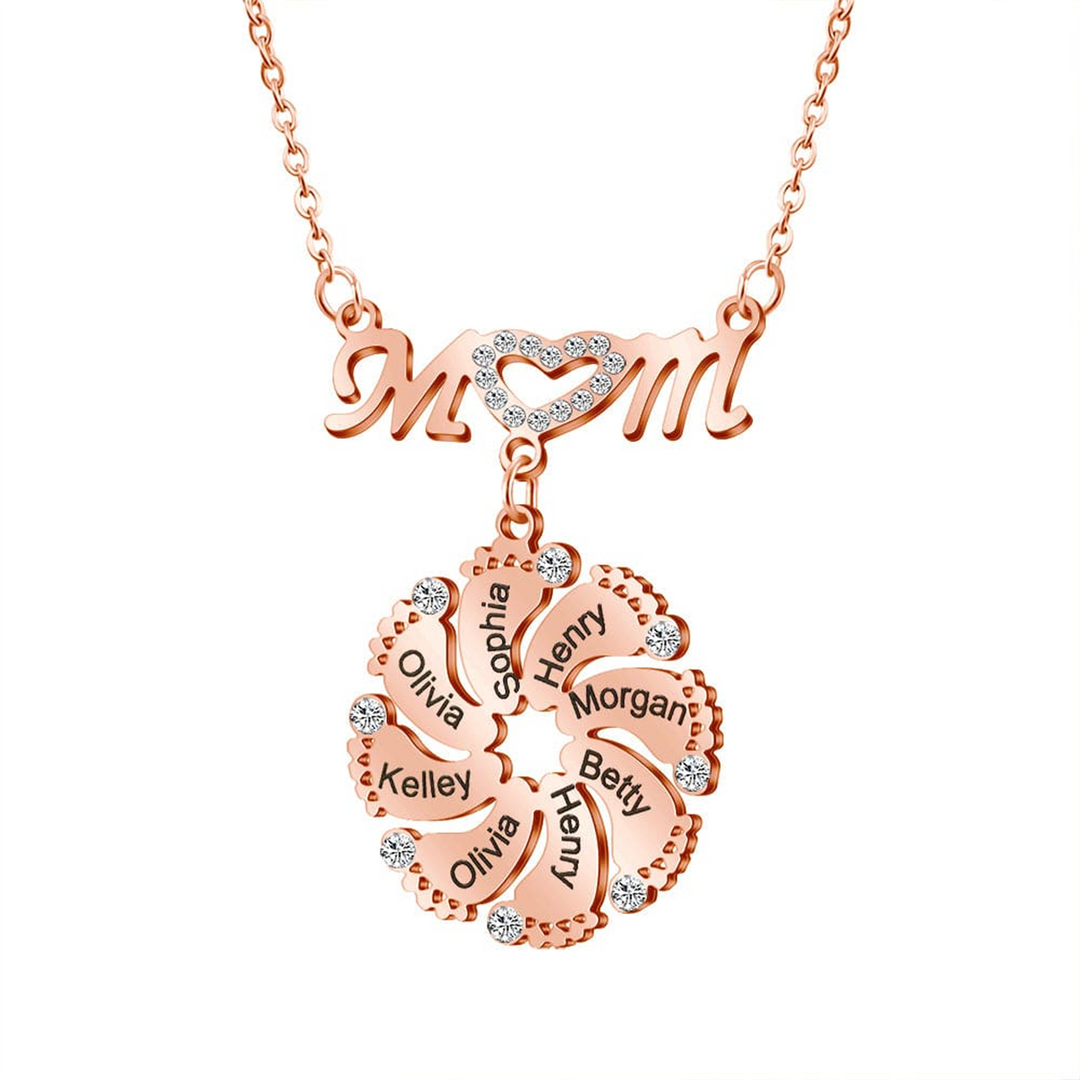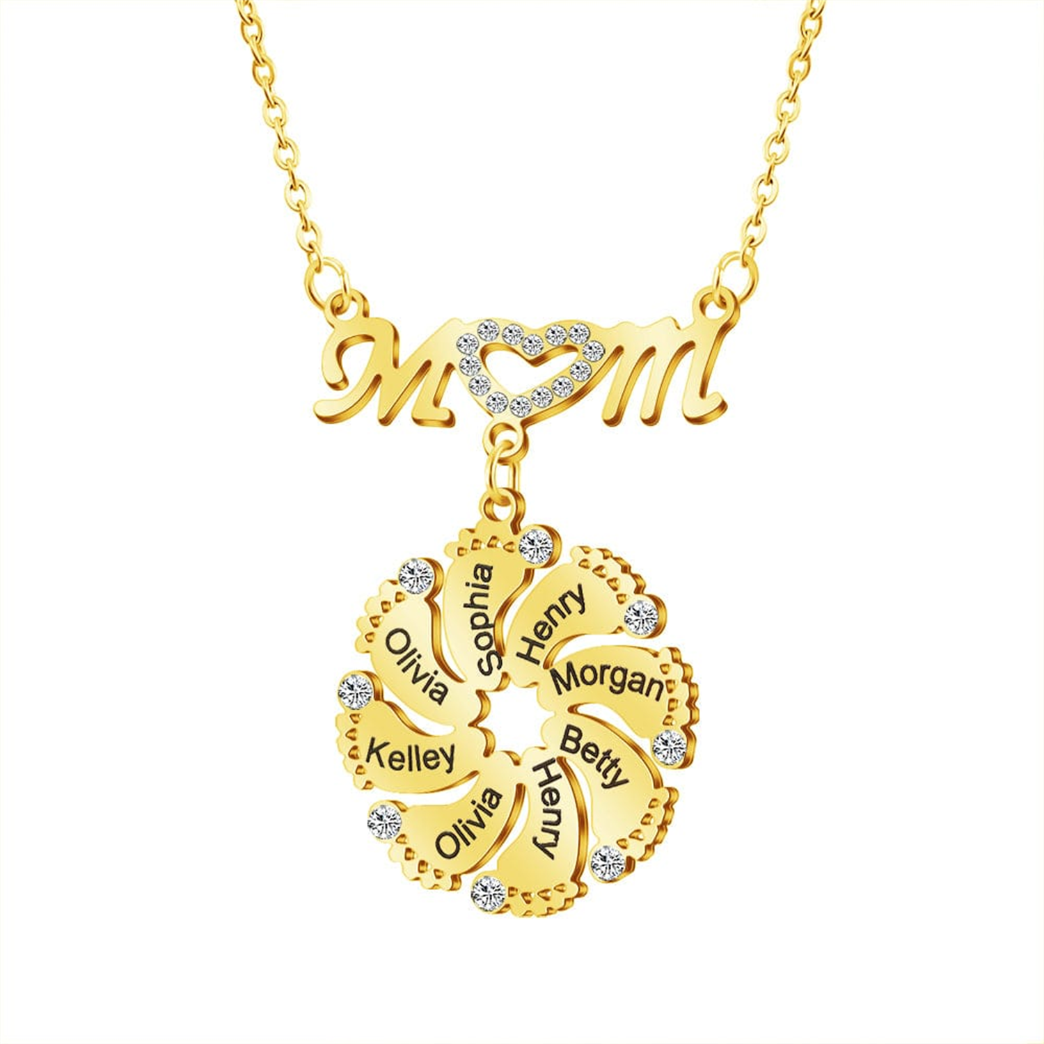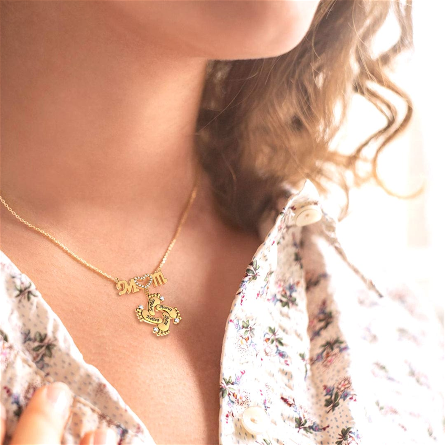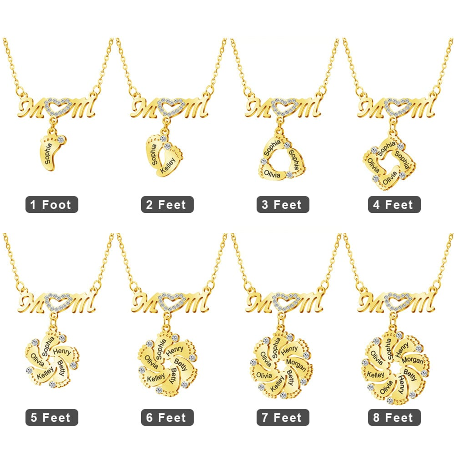 Personalized Diamond Mom Necklace With Crystal Baby Feet Engraved Names Pendant