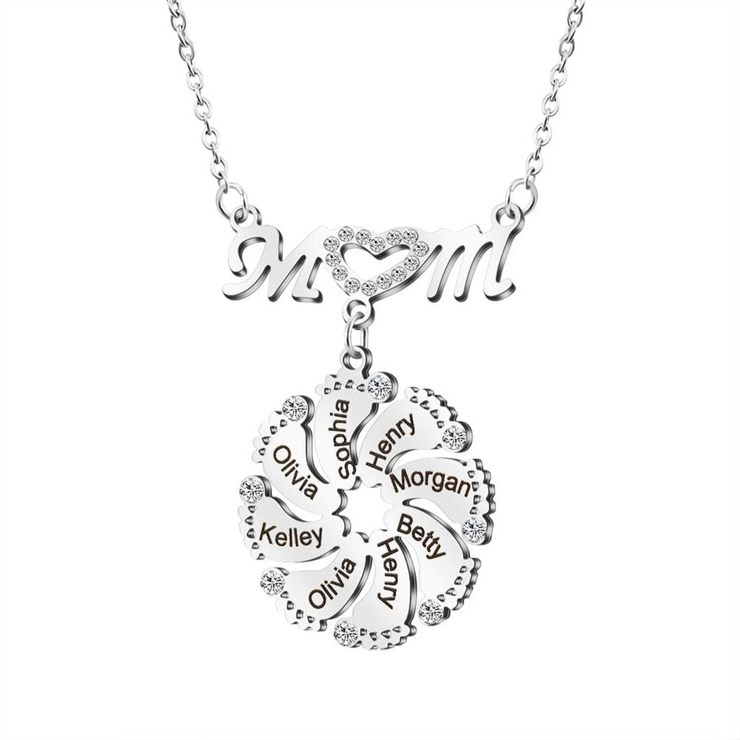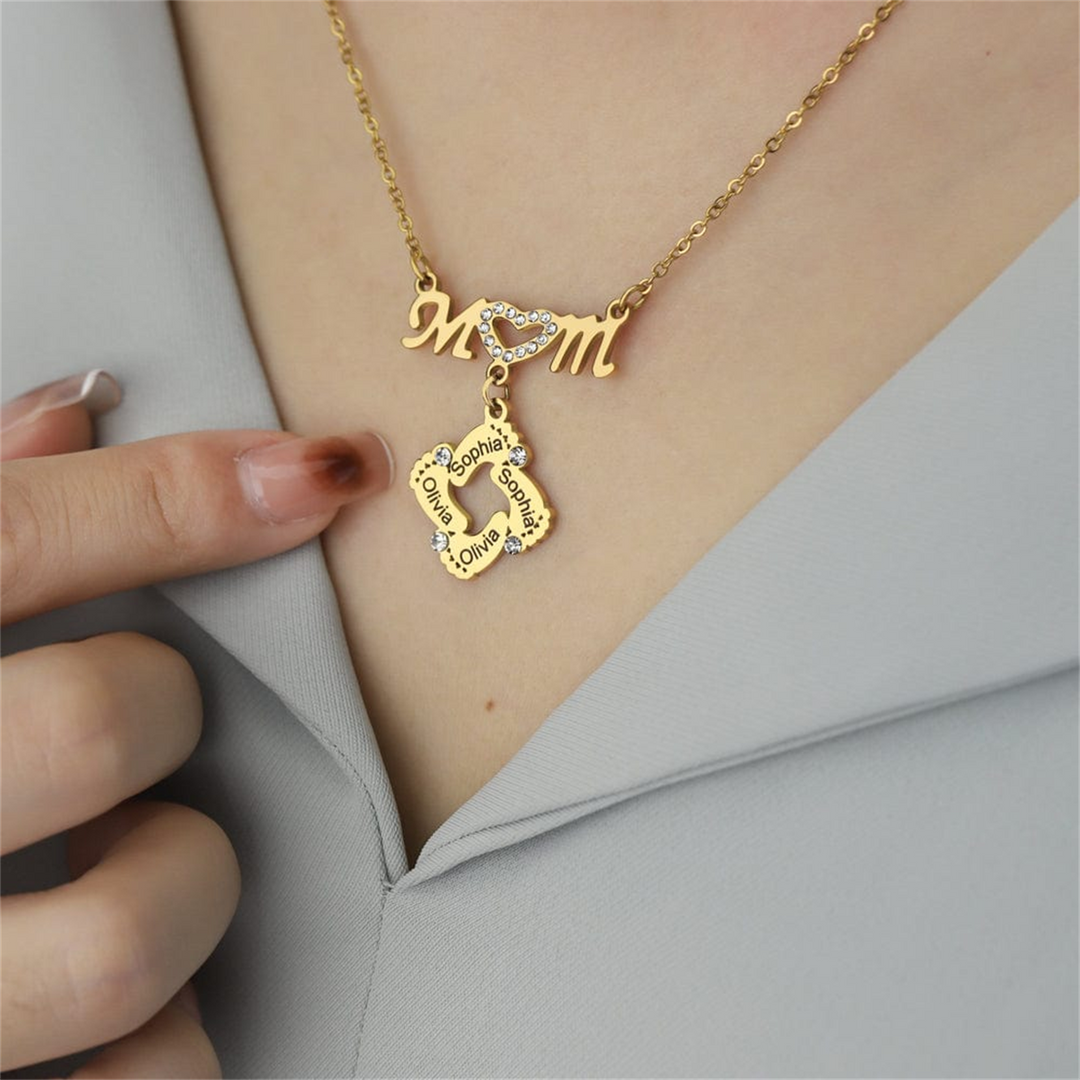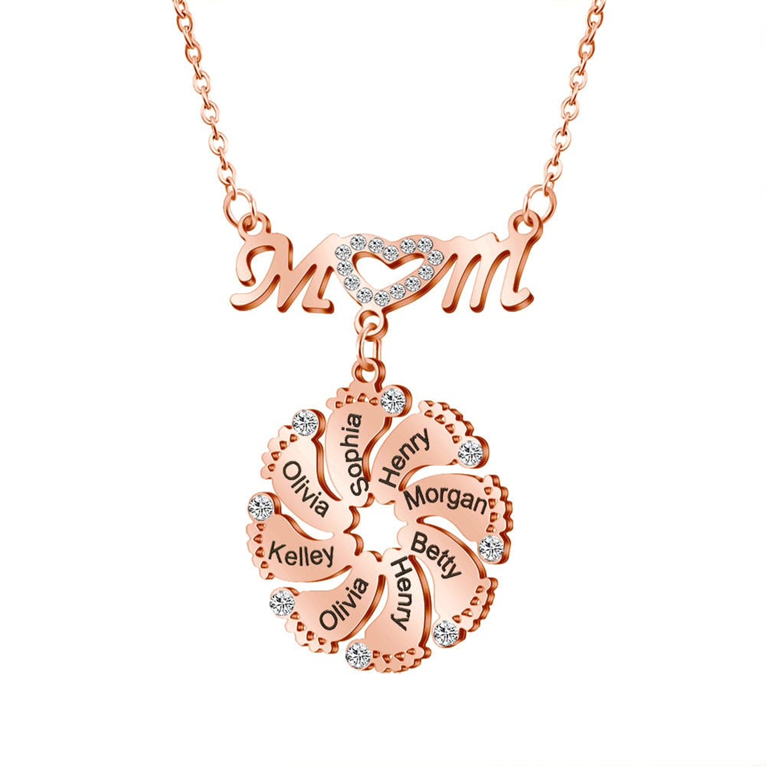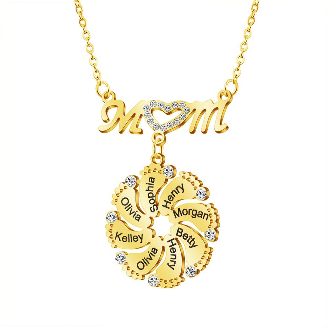 Personalized Diamond Mom Necklace With Crystal Baby Feet Engraved Names Pendant