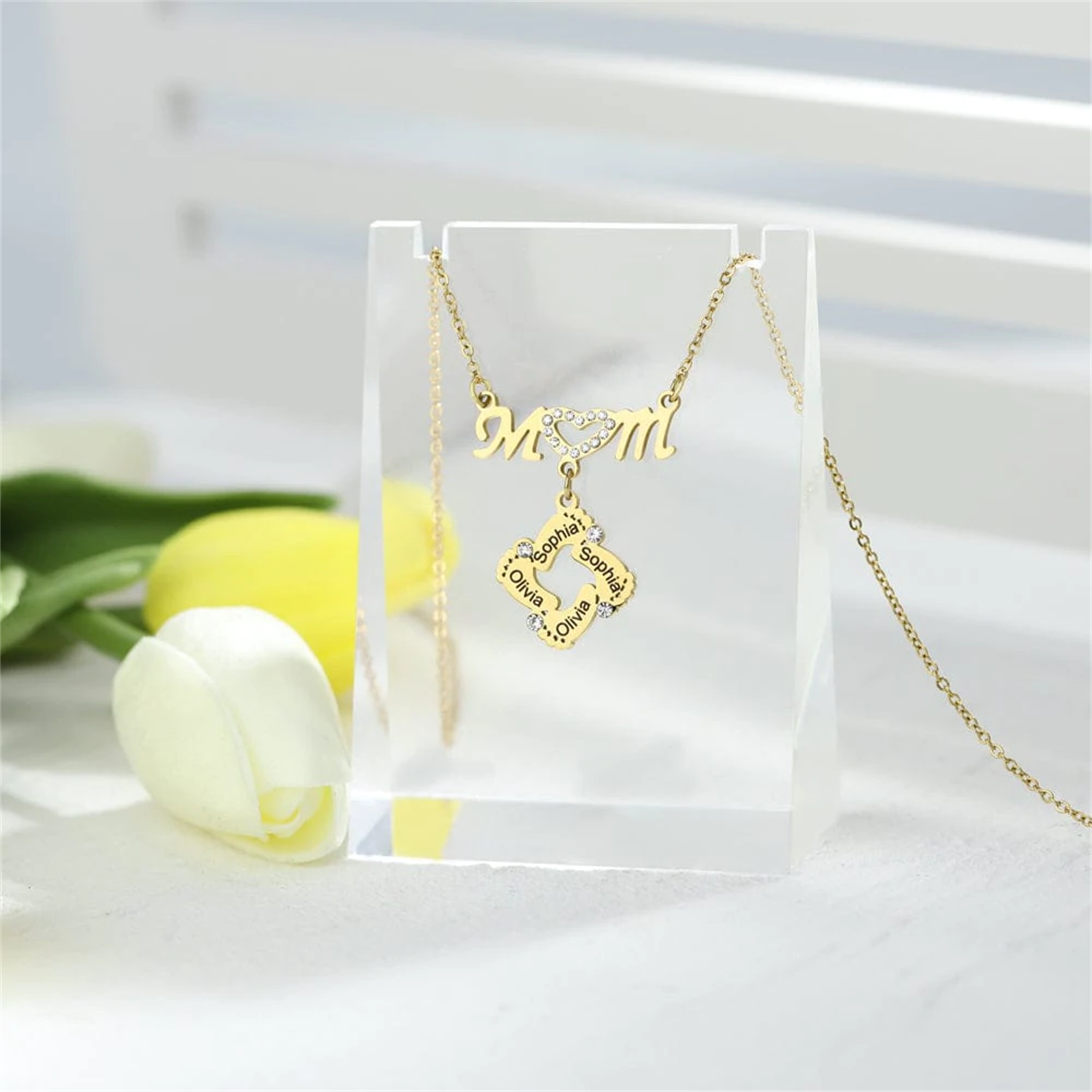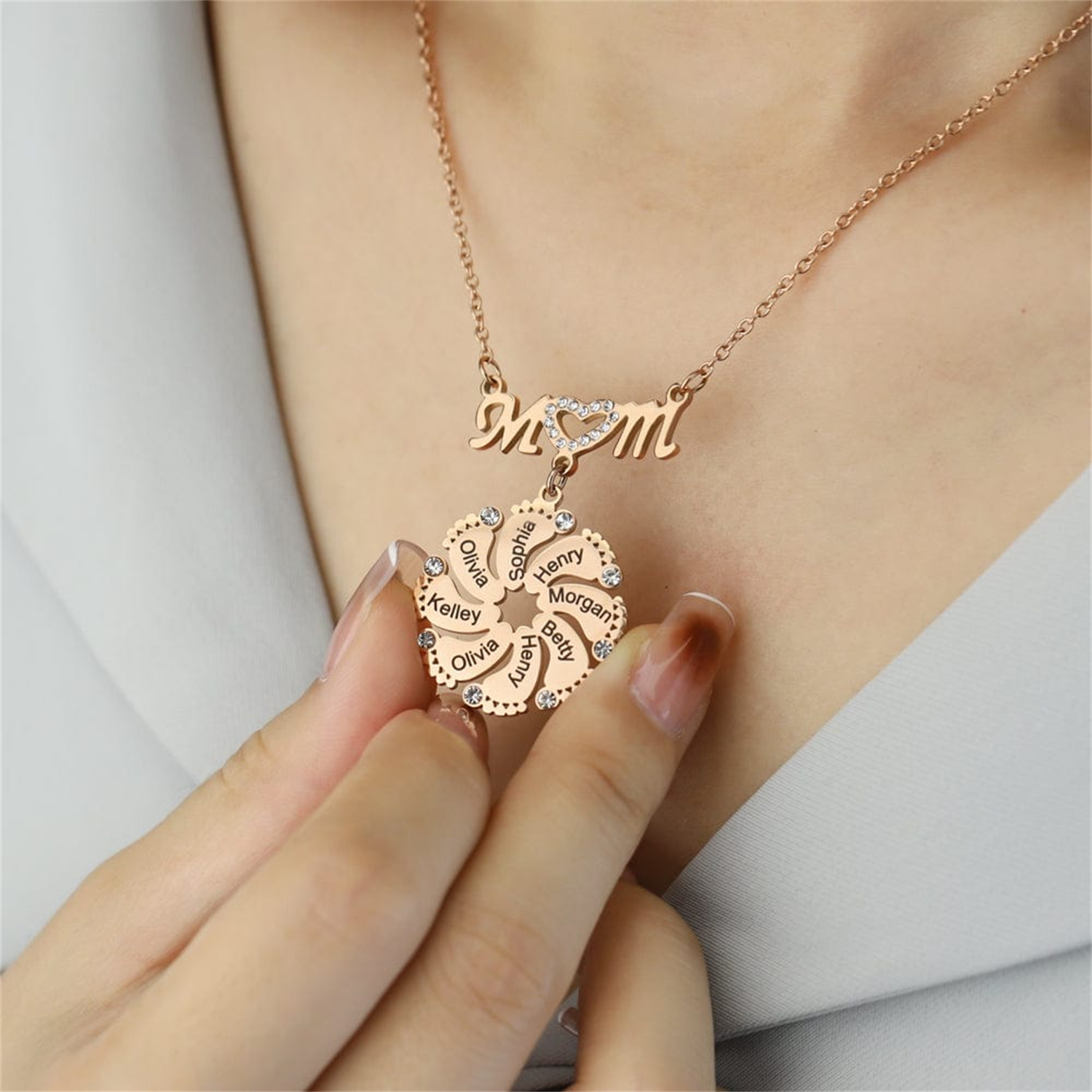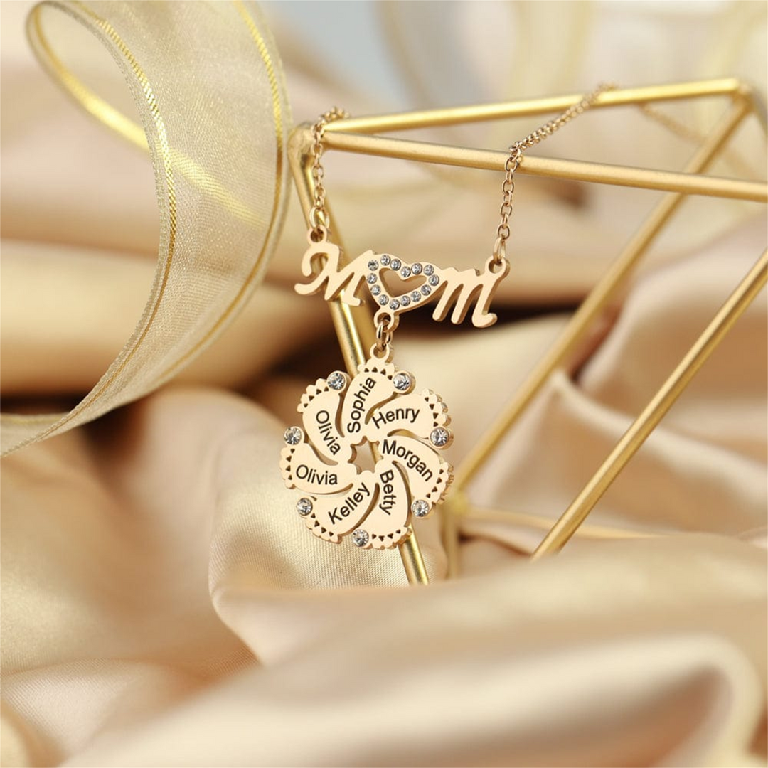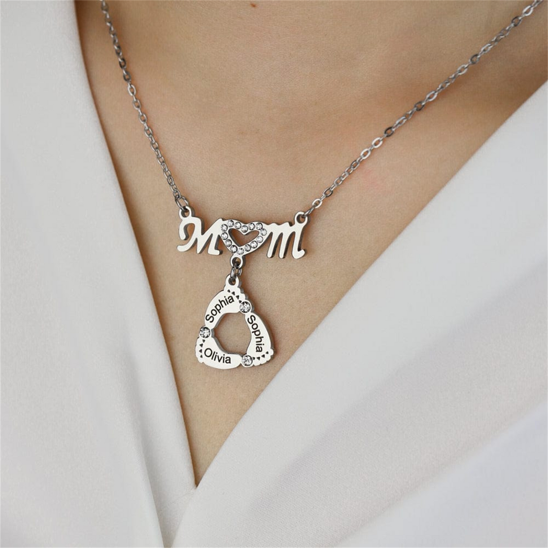 Personalized Diamond Mom Necklace With Crystal Baby Feet Engraved Names Pendant