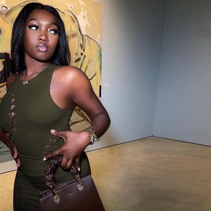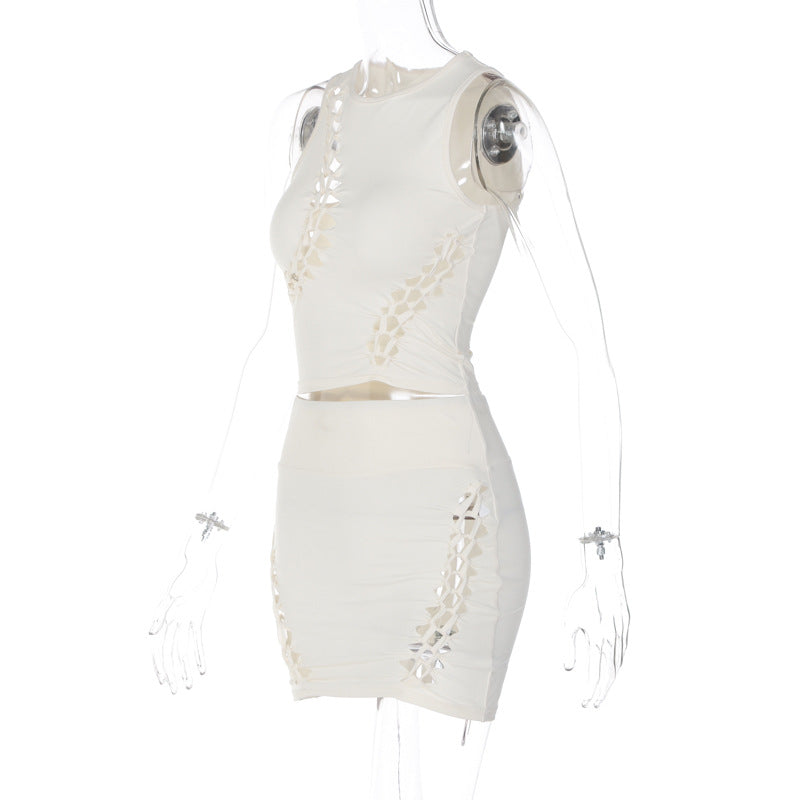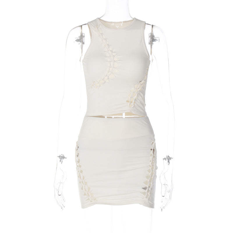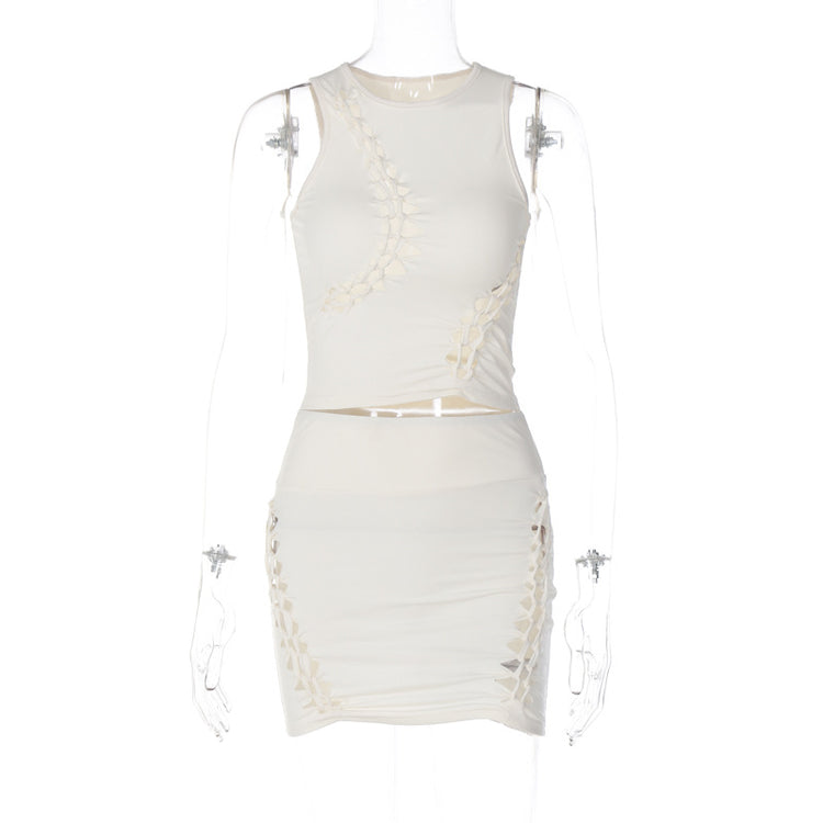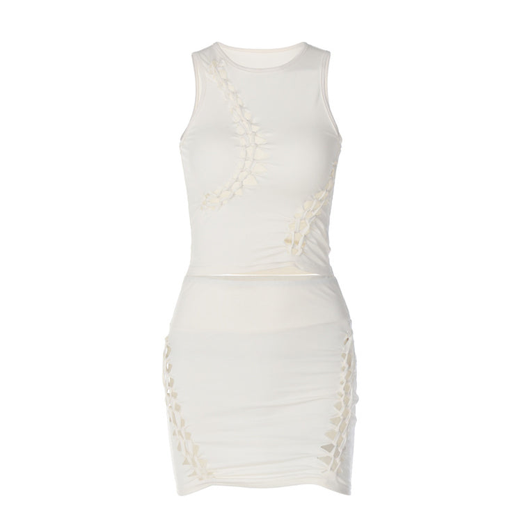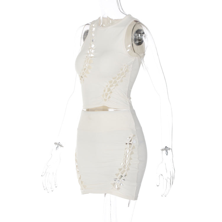 Solid Color Hollow Round Neck Sleeveless Top Slim Skirt Set