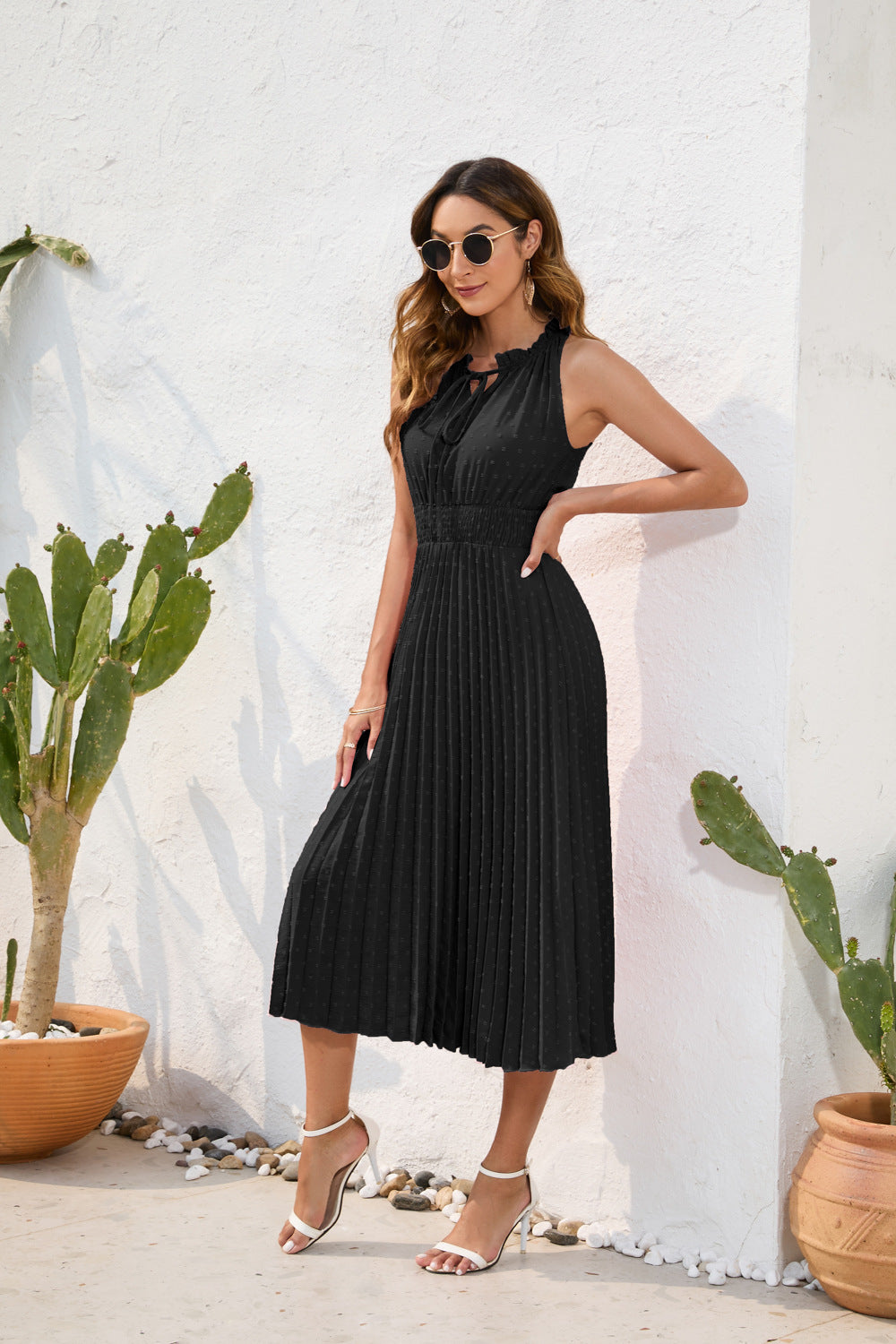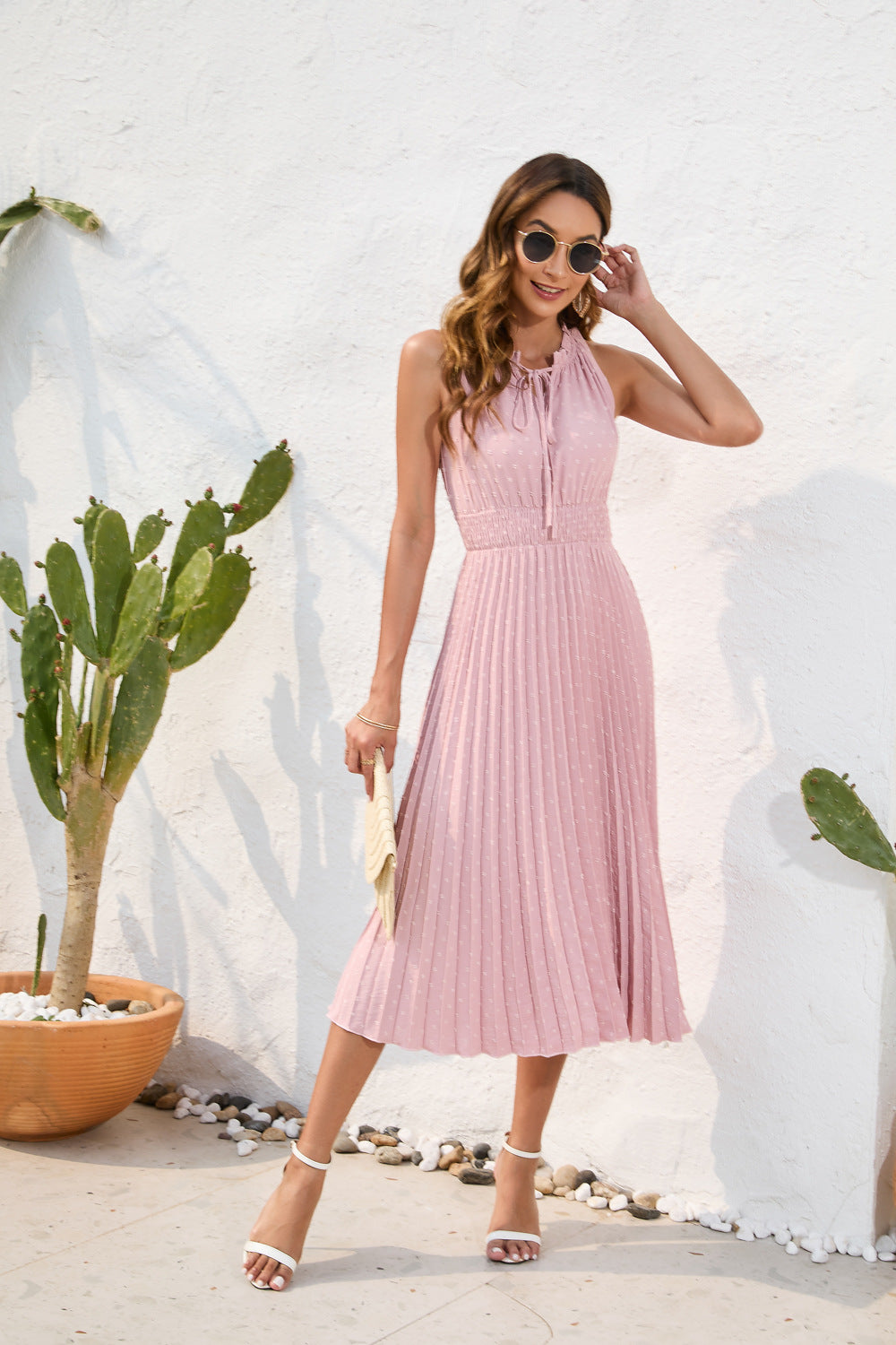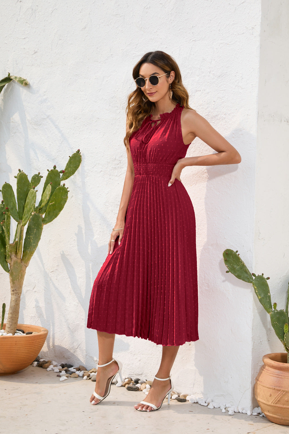 Tie High Waist Pleated Pom Dress Sleeveless Summer Dress