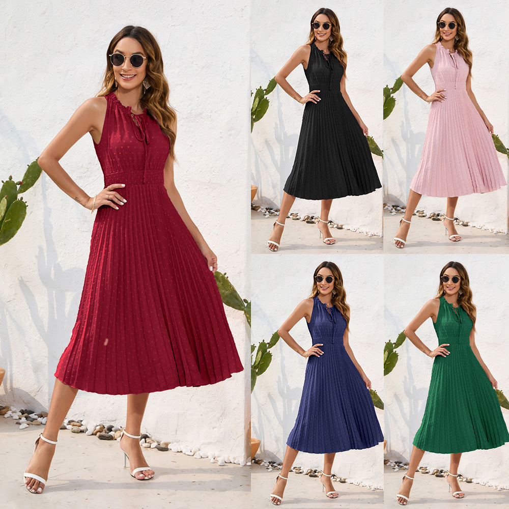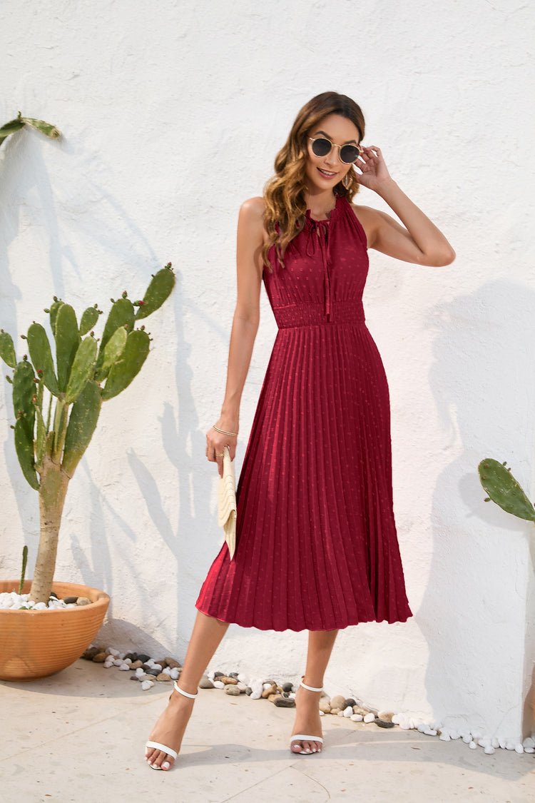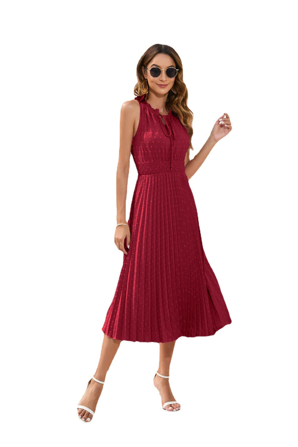 Tie High Waist Pleated Pom Dress Sleeveless Summer Dress
