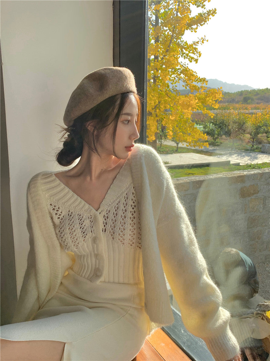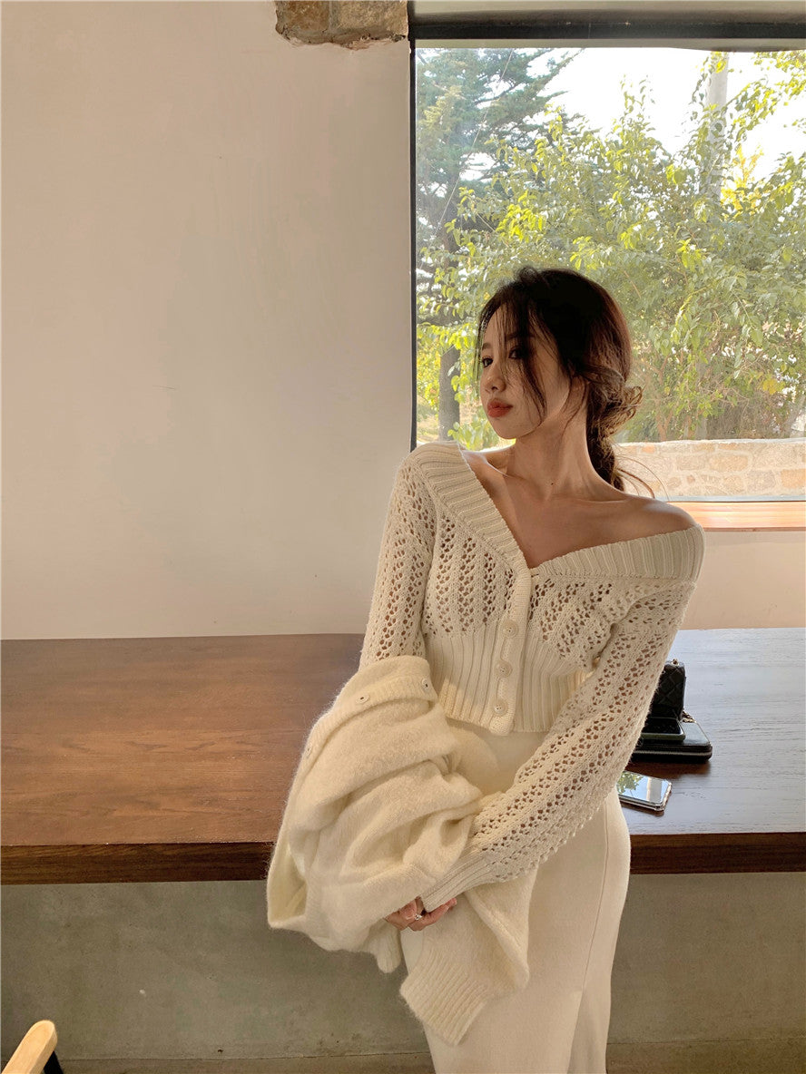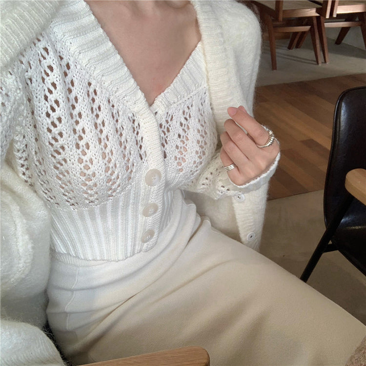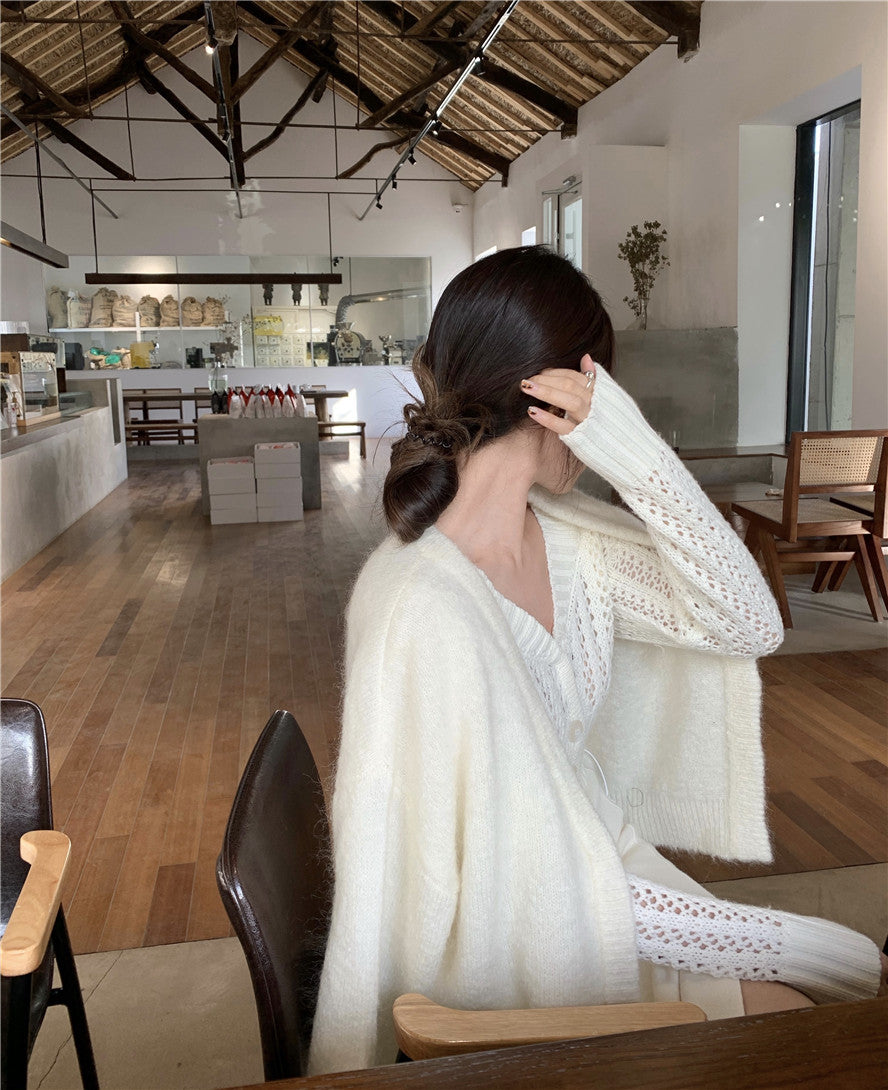 Women Hollow Sweater Cardigan Outerwear V Neck Button Knitted Tops Jackets