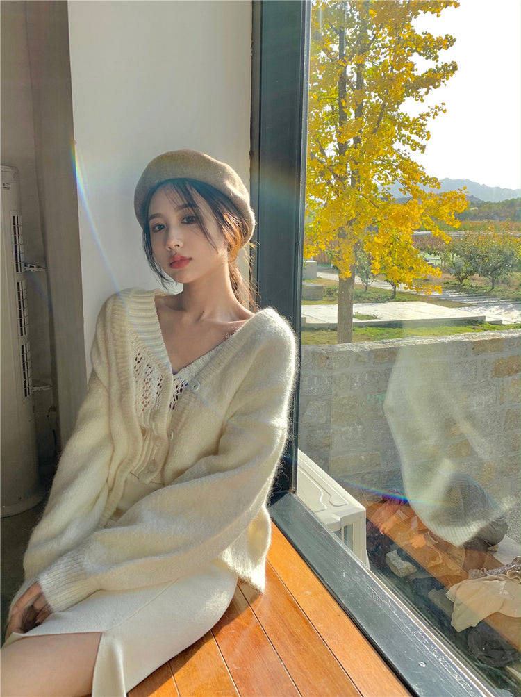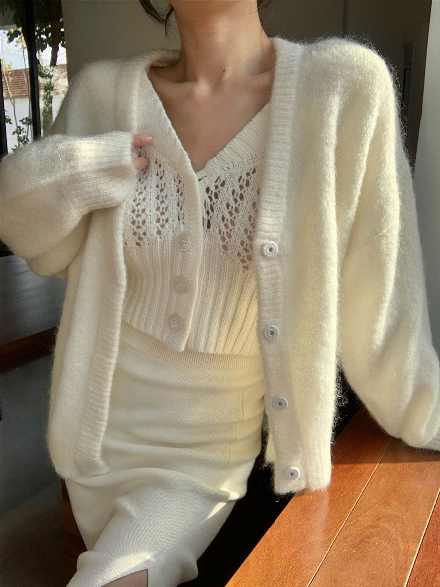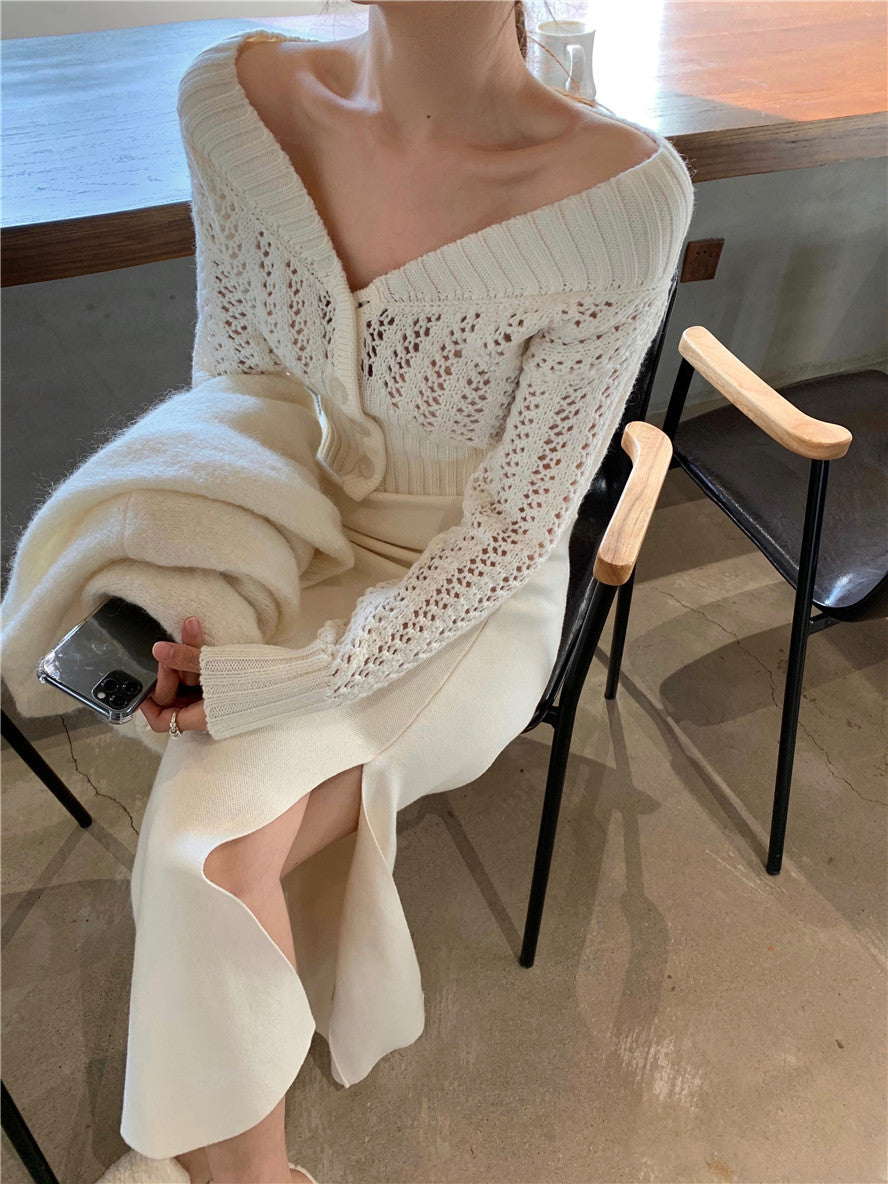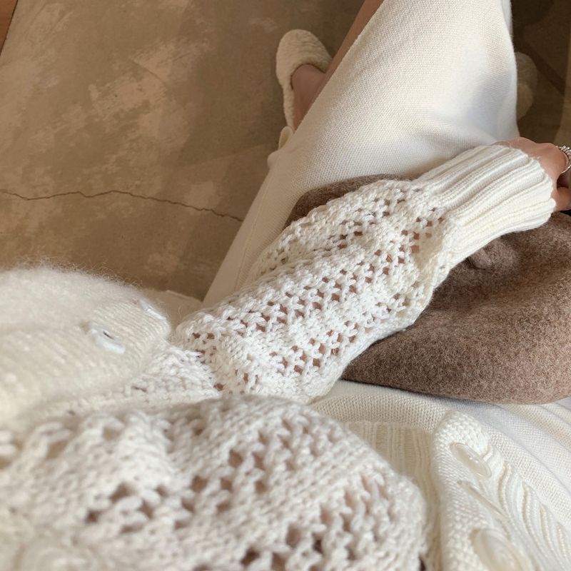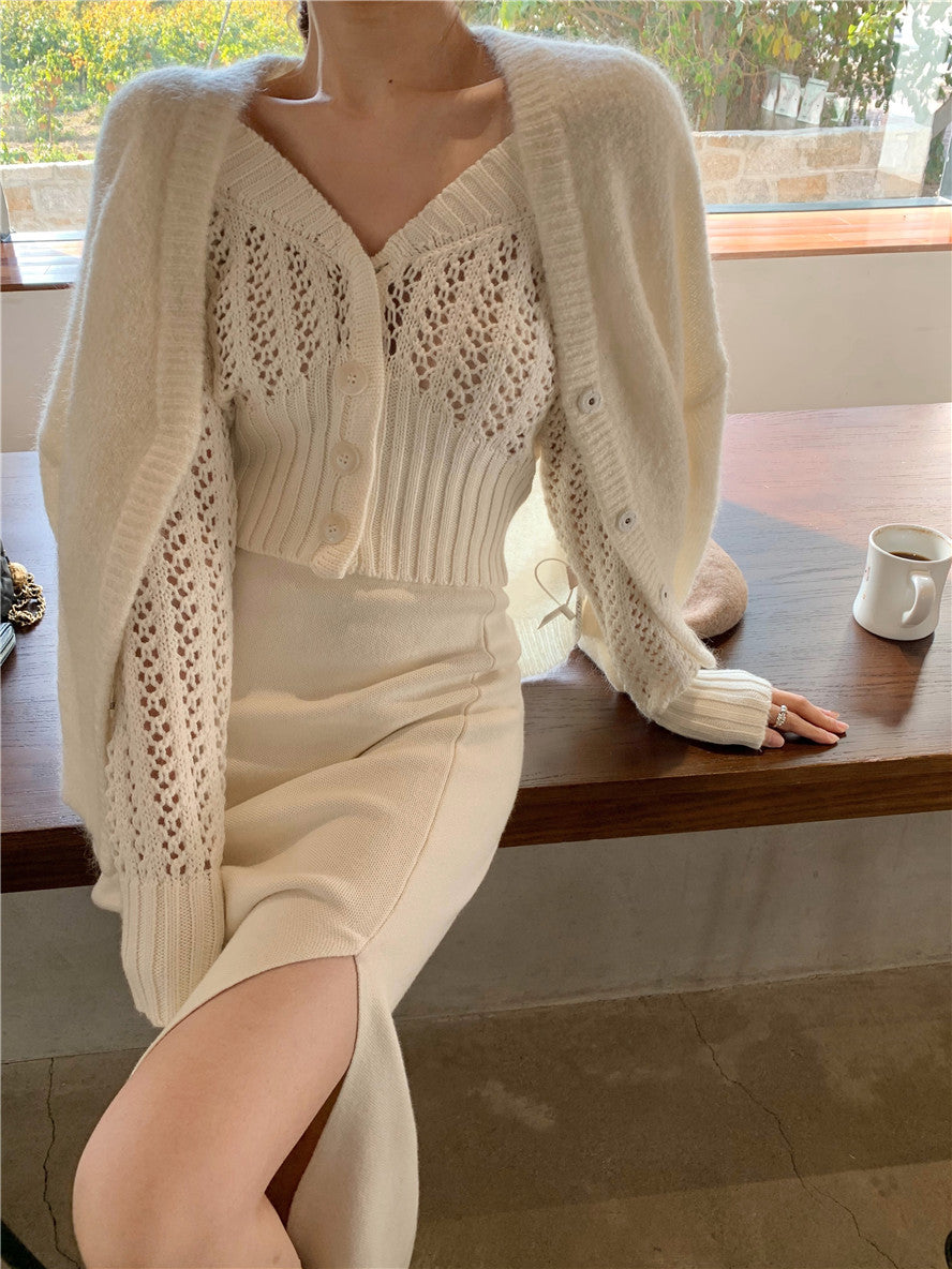 Women Hollow Sweater Cardigan Outerwear V Neck Button Knitted Tops Jackets